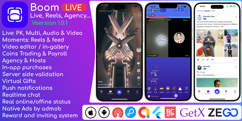Boom Live - PK Battle Reels - Flutter Application. Reels, Feed, Live, PK, Multi-Guest, Agency, Trading, Ranking, Reward, Events, Realtime Chat