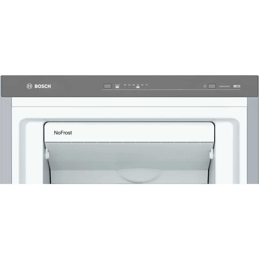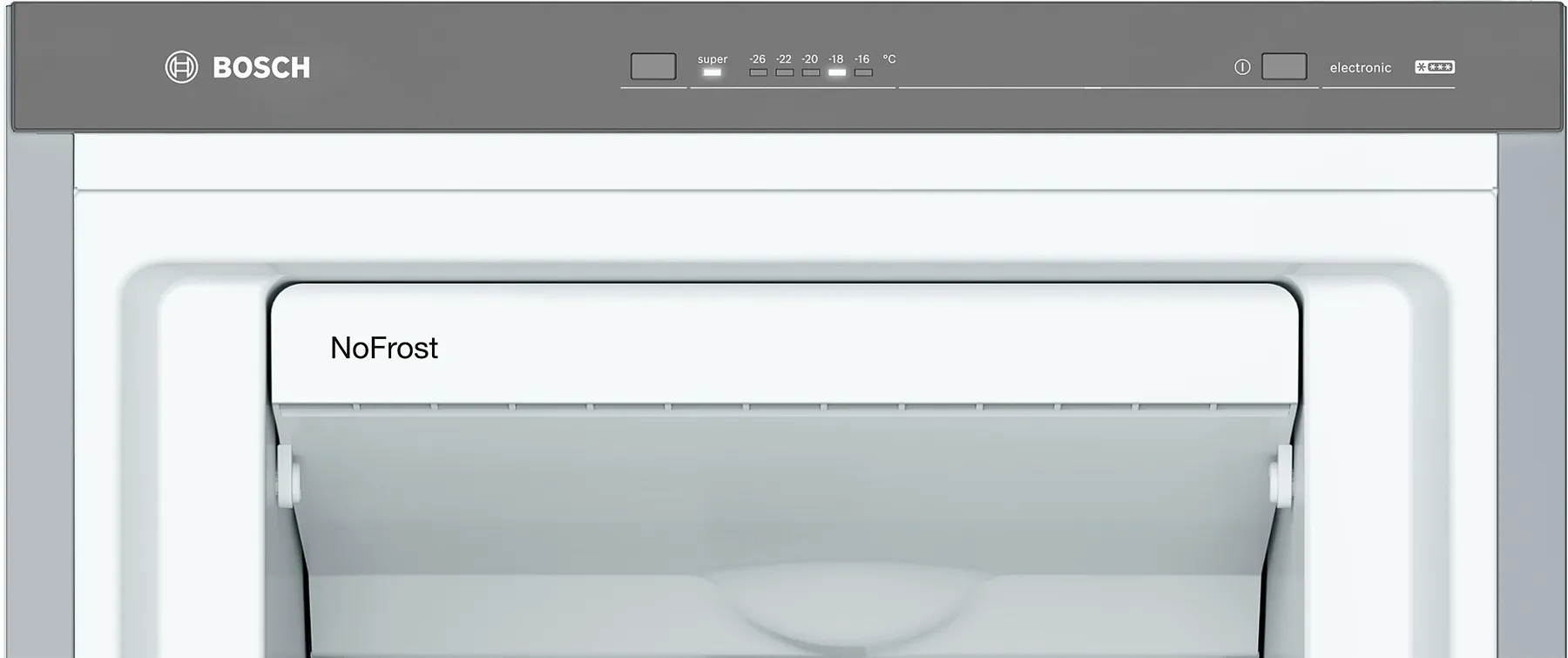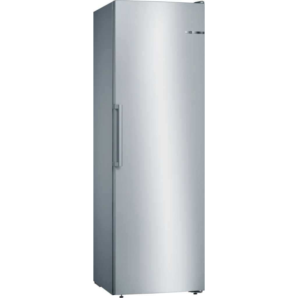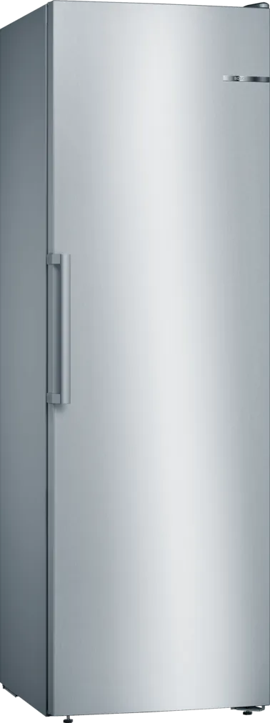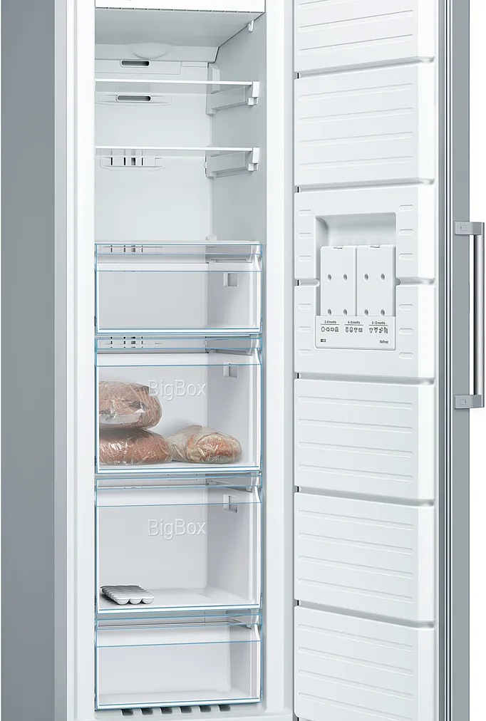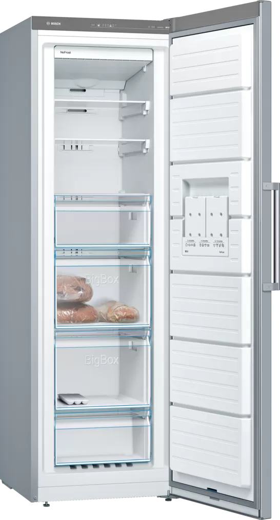 Bosch 242 Liters Freestanding Freezer, 186*60cm, Inox | GSN36VL3PG, Serie 4 – Stainless Steel. No frost 2 in built cool packs for cooling retention Digital temperature control Solar power compatible Transparent freezer drawers Key Features: Bosch 242 Liters Freestanding Freezer, 186*60cm, Inox | GSN36VL3PG, Serie 4 – Stainless Steel. Serie | 4 Door color Stainless steel look NoFrost, Tall freezer BigBox frozen food drawer: for stacking storage containers or for large frozen food items VarioZone: more flexibility due to variable-use glass shelves and drawers in the freezer compartment NoFrost: never defrost again, thanks to perfect protection from ice formation – that saves time and effort. FreshSense: Internal sensors monitor the internal and external temperatures and adjust to provide longer freshness MultiAirflow System provides even air distribution in the fridge for prolonged freshness