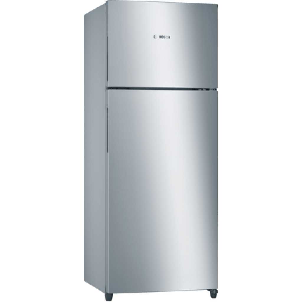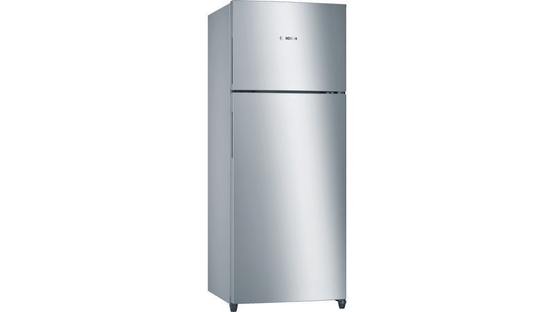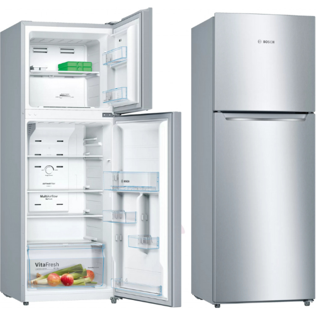 Bosch 250 Litre Freestanding 2 Door Top Freezer Refrigerator Capacity: 250 litres ChillerBox: Keeps meat and fish fresh up to 2 times longer with cooler temperatures CrisperBox: Keeps fruits and vegetables fresh longer with humidity control AirFresh Filter: Neutralises unwanted odours and ensures fresh air inside the appliance NoFrost: never defrost again, thanks to perfect protection from ice formation – that saves time and effort. IceTwister: Easy to fill and remove ice cubes Interior LED Light: Brighter lighting to help you to see the fridge interior more clearly Chrome inox (metallic) Vertical Bar Handle Interior with metal applications
