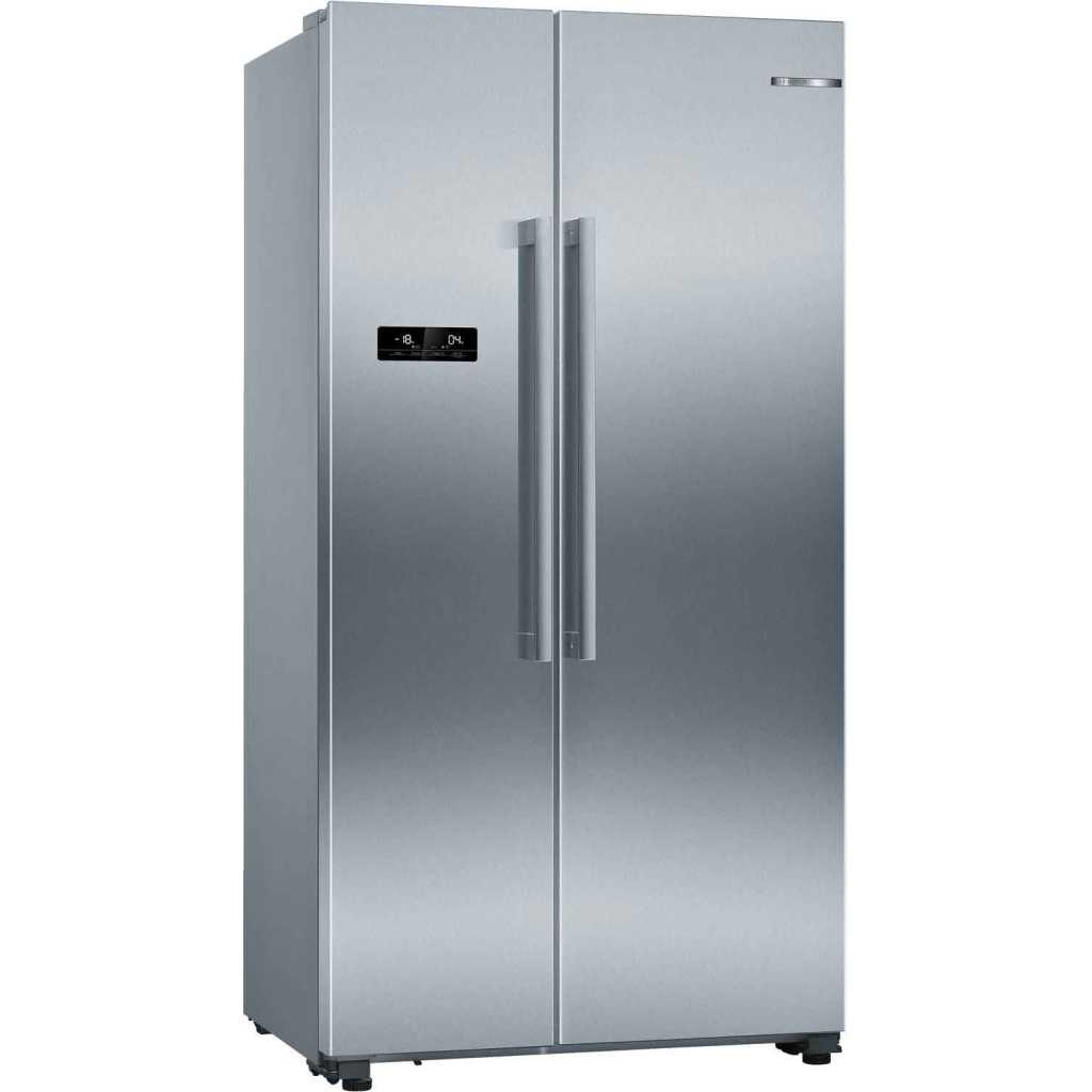 Bosch 616 Litres Fridge, KAN93VIFPG Series 4 – American Side By Side – 178.7 x 90.8 cm – Brushed Steel Anti-Fingerprint. MultiBoxes with rippled base: protects fruits and vegetables from condensation NoFrost: never defrost again, thanks to perfect protection from ice formation – that saves time and effort IceTwister: easy to remove and fill – for lots of ice cubes TouchControl operation: convenient temperature control via easy-to-read sensor fields 560 Litres of usable space, 371 litres in the fridge and 181 litres in the freezer 1 year warranty for peace of mind Dimensions (mm): H1787 x W908 x D707 5 Fridge shelves, 2 fruit and veg drawers, 5 freezer shelves, 3 freezer drawers, 1 twist ice maker The NoFrost side-by-side fridge-freezer with indoor electronics: provides a modern door display Egg rack The egg rack keeps your eggs fresh and prevents them from cracking. Full flexibility in the freezer area You can remove all the safety glass shelves in the freezer area really easily to create more space – to store a multi-level cake, for example, or a whole turkey. Large foods such as a family-sized pizza can be stacked on the glass surfaces without any problem. Alarm The alarm system signals a sound or light when the door is not closed properly or when other errors occur. Save energy whilst you are away When the Holiday Mode function is activated, the temperature in the fridge section is approx. +14°C and in the freezer approx. −18°C, protecting frozen foods and preventing energy wastage in the fridge. Protects frozen food from defrosting Adding new food to the freezer raises the internal temperature, which can result in defrosting and a loss of flavour. The SuperFreezing function ensures that new food is frozen quickly and thereby prevents the other content inside the freezer from defrosting. Appliances with an automatic freezing function return to normal operation once the required temperature is reached, in order not to waste energy. As a result, frozen food keeps its flavour, even when new food is being added. The fridge that knows how to keep its cool Activate the SuperCooling function before you go shopping lowers the temperature for a short period, so your fresh shopping is kept at the right temperature. The temperature is lowered by pushing a button (2°C at the lowest). To prevent unnecessary power consumption, the function automatically switches back after approximately 6 hours. Multi Airflow System: even air distribution for longer freshness The fan-assisted MultiAirflow System causes gentle, even currents of cold air to emerge at all levels of the chilling and freezing area. Temperature fluctuations are minimised and cooling times reduced – which helps your foods retain their flavour for longer. FreshSense: perfect storage climate Thanks to the optimum storage conditions, your food preserves an ideal consistency; ice cream, for instance, is neither too soft nor too hard. A constant temperature in the fridge interior is a decisive factor in achieving more freshness and flavour. FreshSense sensors constantly monitor and control the ambient, fridge and freezer temperature. A constant temperature inside the fridge, independent of the outer temperature, is the result. Never defrost your fridge again Defrosting a fridge by hand can be very annoying and time-consuming. Thanks to our new fridges with NoFrost, you can easily remove this task from your to-do list for good. Unlike in conventional fridges, the air humidity in a NoFrost fridge is permanently collected in a central chiller unit, which automatically defrosts on a frequent basis. The resulting condensation is simply channelled outside out of the fridge, where it then evaporates. This way, NoFrost permanently keeps your fridge free of not only ice, but also the need for manual defrosting. For totally cool drinks: The Ice-Twister Now you can compete with any beach bar. With fresh ice cubes from the practical and removable ice twister, your cold drinks will taste even better. With 20 ice cubes per fill, its quick and easy to get refreshingly cool beverages at the drop of a hat. Keeps the contents of your fridge in the spotlight LED lights bring a completely new lighting concept to fridges, guaranteeing even, glare-free interior illumination. LED lights use less electricity than conventional fridge lights and last an (appliance) lifetime. Enough space for all your fresh food The multi box drawer is suitable for storing fruits and vegetables – especially large items such as big lettuce have enough space.