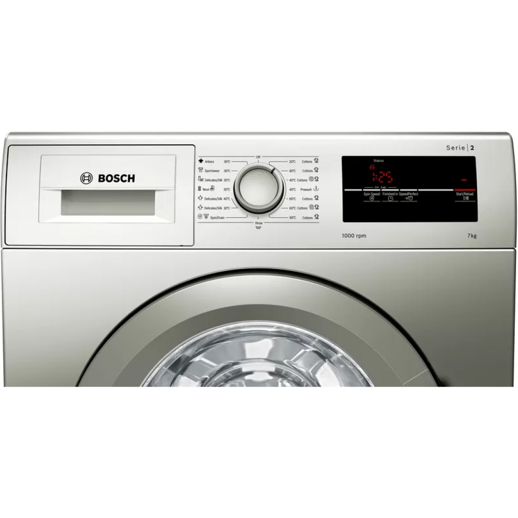 Key Features: Bosch 8KG WAJ2018SKE Front Load Washing Machine 8KG – Silver 8Kg Front loader 1000 Rpm A+++ Energy efficiency rating Eco silence drive motor Anti-vibration side panel design 15 programs (Ankara, Sportswear 30, Delicates/Silk 30, Wool 30, Easy care 40, Easy care 30, Spin/Drain, Rinse, 20 Cotton, 40 cotton, Cotton Eco 40, Pre-wash 40, Cotton 60, Cotton Eco 60, Cotton 90) Active water plus Wave drum design Speed perfect function Large LED display panel Detergent, softener and bleach dispenser Emergency manual drain Silver finish