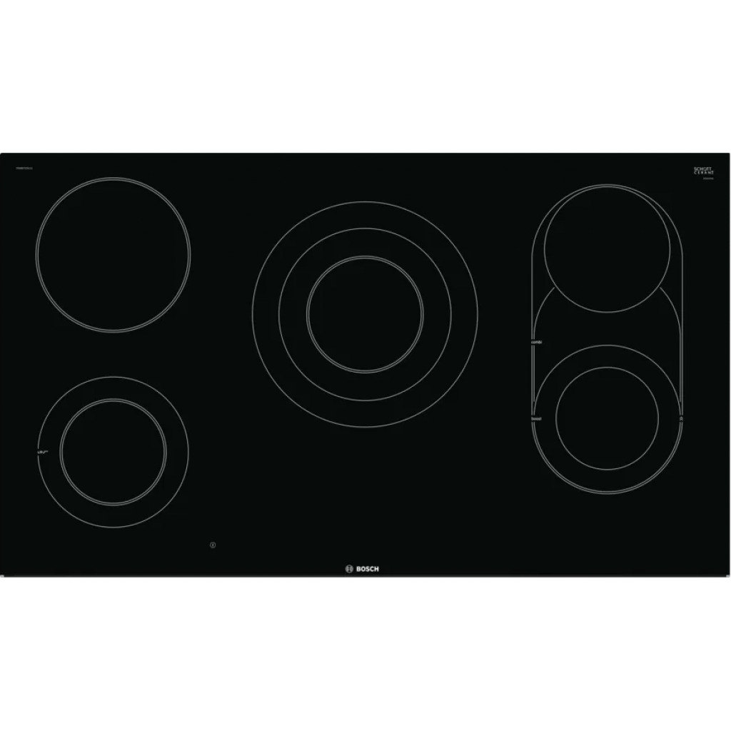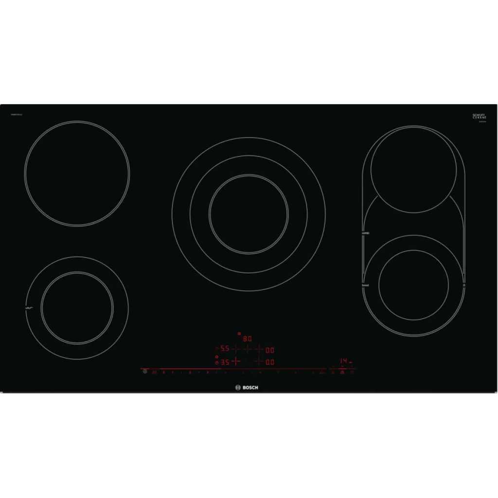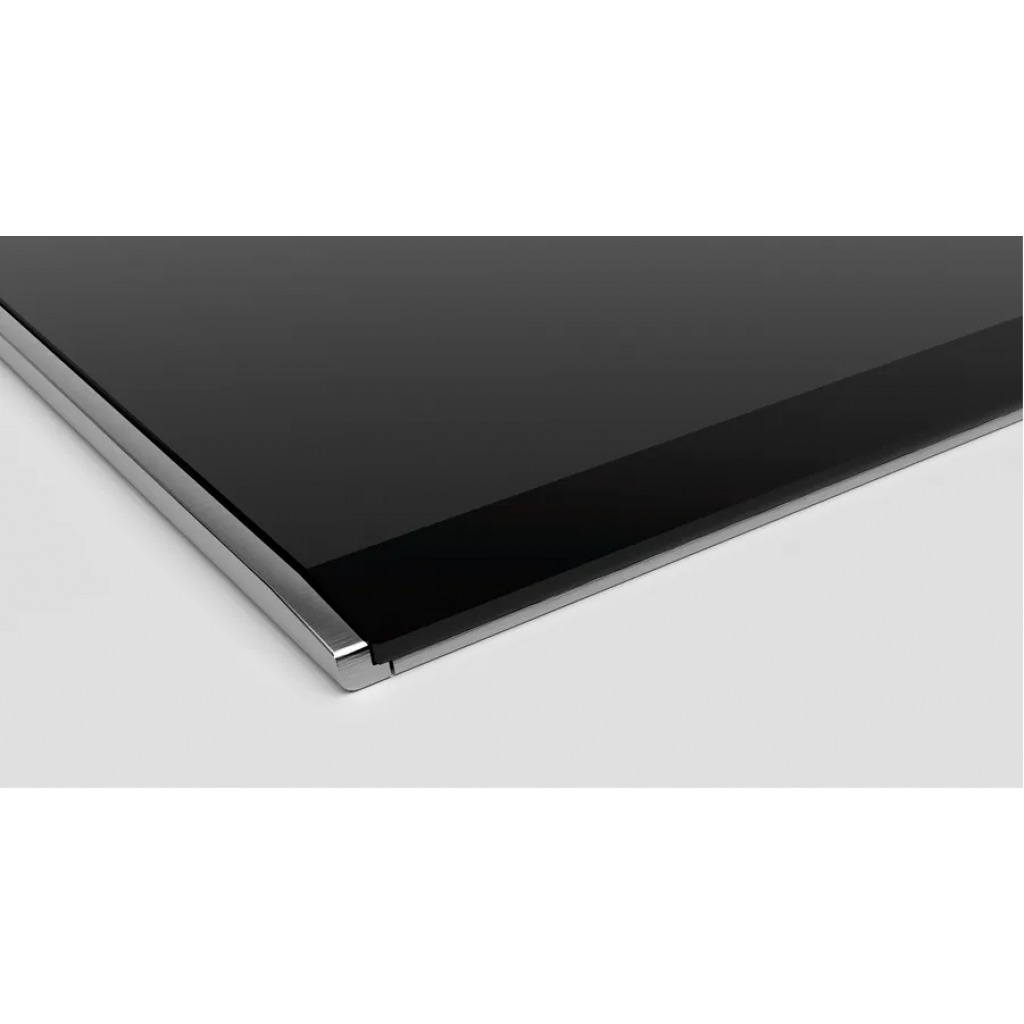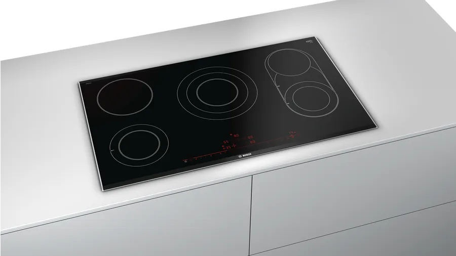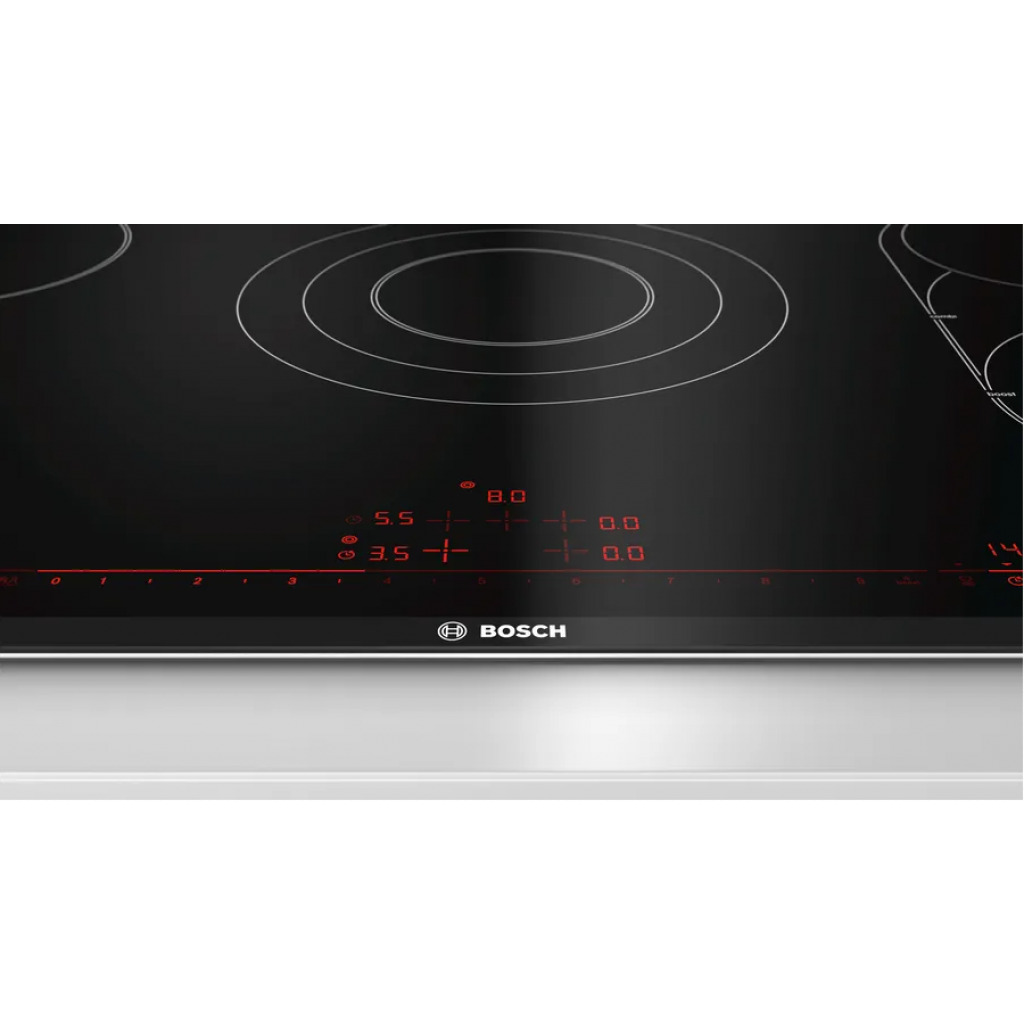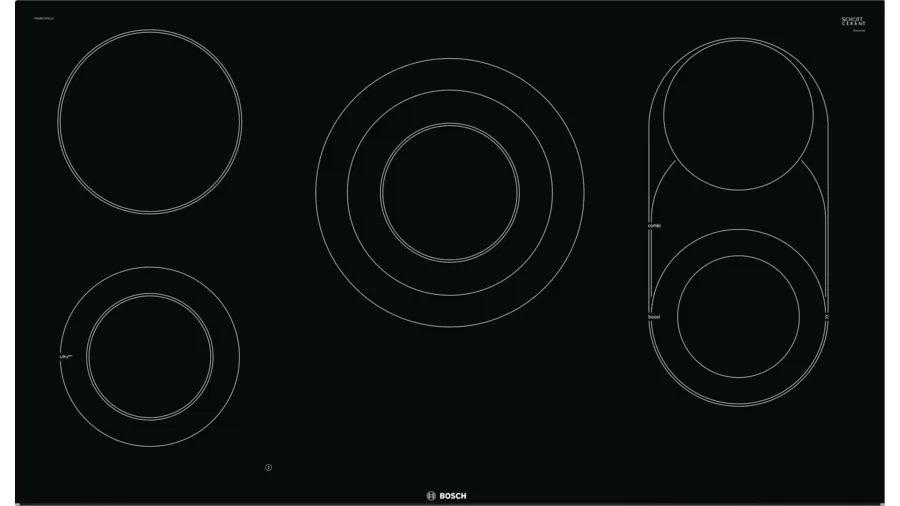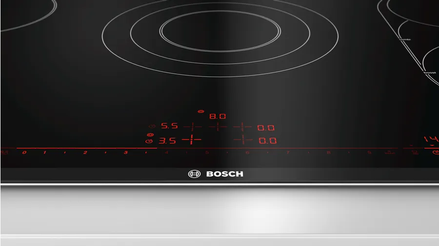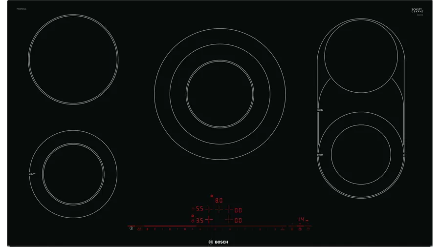Bosch 90cm 5 Plate Ceramic Hob, Black | PKM975DK1D DirectSelect Premium: Direct, simple selection of the desired cooking zone, power and additional functions. PerfectFry: For perfect browning of roasted foods thanks to sensor control with 5 power levels. CombiZone: More flexibility by combining two cooking zones, for roasters and the like. ComfortProfil: Elegant, appealing design with bevelled front and metal strips on the side. PowerBoost: selectable boost in power output for a 20% shorter time to boiling. 5 HighSpeed cooking zones, including: 1 dual zone 1 triple zone 1 CombiZone Variable 17-stage power settings for each zone 2×7-Segment Timer with automatic shut off for all zones Buzzer Count up timer per cooktop Keep warm function Freeze function Restart fuction Main switch Power on indicator light 2 stage Hh residual heat indicator for each zone Safety lock Automatic safety switch-off Individual tunable energy consumption display Dimensions of the product :44 x 916 x 527 mm