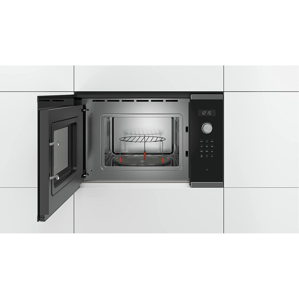 Bosch BEL524MS0 Series 6 Integrated Built-in Microwave, 60 x 38 cm, 20 Litres, White Bosch BEL524MS0 Series 6 – Built-In Microwave, 60 x 38 cm, 20 L, White Product Description The Bosch BEL524MS0 Microwave has a large cavity of 25 litres which is suitable for large food. These removable buttons allow easy adjustment of the 5 available power levels. The elegant design allows you to easily blend in. Product features: display LED retractable buttons, push pull buttons, touch control control, main features: volume 25L, 5 microwave power: 90W, 180W, 360W, 600W, 900W, 7 automatic programs, 4 defrosting and 3 in microwave function, memory function (1 position) comfort turntable glass: 31 5 cm. Electronic clock, LED lighting, cavity lighting. Left hinges Opening of the electronic door. Connection cable:130cm Total connection power:1.45KW Rated voltage 220-230V. Bosch has made the task of making life easier by providing reliable, efficient and comfortable equipment. Bosch was founded in 1886 when Robert Bosch opened its first engineering workshop in Stuttgart, Germany. Decades later, the brand has established itself as a reference for household appliances and used with the ever recognised quality. Bosch Technologies for Life