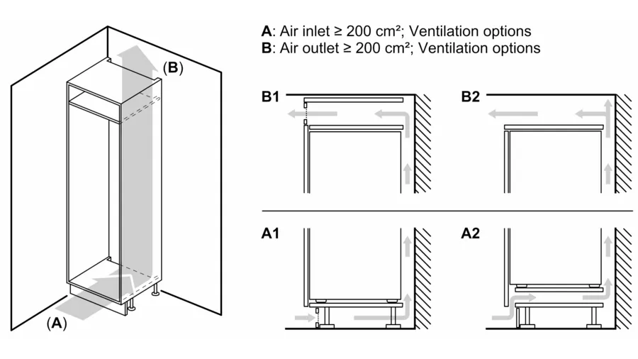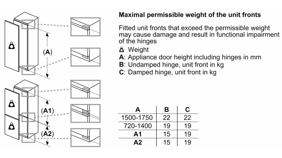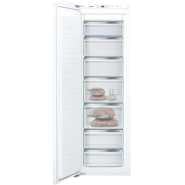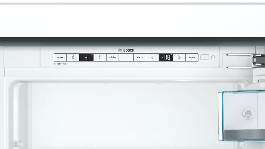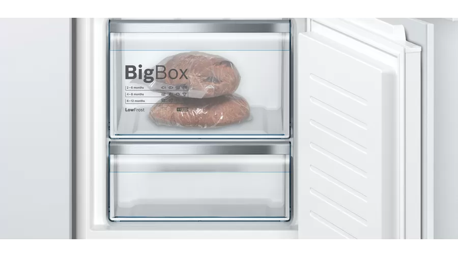 Bosch Integrated Upright Fridge, 177.5 x 56cm, Fixed Hinge | Serie 6 | KIR81AFE0G The bottom freezer with VitaFresh plus drawer: keeps your fruit and vegetables fresher for longer. Lots of space for XXL frozen goods with the BigBox drawer. An extra-deep frozen food drawer for practical stacking of frozen foods container or large frozen items like gateaux or pizzas. No matter whether you have to cater for a child’s birthday or freeze a wedding cake – in the BigBox you will find enough space for large frozen goods. Effortless storage solutions The divided vario shelf in safety glass can be effortlessly adjusted for putting items into the fridge and removing them. It is ideal for larger items, like upright bottles or bowls, giving you complete flexibility when you need more space. The other half of the shelf is particularly convenient as it smoothly slides under the first. Egg rack The egg rack keeps your eggs safe and prevents them from cracking. Full flexibility in the freezer area You can remove all the safety glass shelves in the freezer area really easily to create more space – to store a multi-level cake, for example, or a whole turkey. Large foods such as a family-sized pizza can be stacked on the glass surfaces without any problem. Insert and remove items at the turn of a hand The shatterproof, frameless glass shelves are particularly easy to use, thanks to the smooth pull-out mechanism. And they also give you a clear view of your food at any time. Alarm The alarm system signals a sound or light when the door is not closed properly SuperFreeze Automatic super freezing: optimal for freezing smaller food loads faster whilst protecting your frozen items from defrosting, thanks to the detection of temperature increase and the automatic decrease of temperature. Defrosting less often saves work and is energy-efficient Constantly having to defrost your conventional freezer not only takes up a lot of your time, but takes up your energy too. LowFrost reduces the amount of ice formation in your freezer to eliminate the need for frequent defrosting. If defrosting should ever be necessary, our freezers with LowFrost feature a practical vent at the base of the appliance for a quick, fuss-free fix. Choose the freezer that looks after you, and itself. Two separate cooling circuits are more convenient and save energy 2 separate cooling circuits, which allow you to control the chilling and freezer compartments independently. Easy-to-use electronic controls allow you to adjust the temperatures individually and prevents odour transfer. The fridge that knows how to keep its cool Activate the SuperCooling function before you go shopping lowers the temperature for a short period, so your fresh shopping is kept at the right temperature. The temperature is lowered by pushing a button (2°C at the lowest). To prevent unnecessary power consumption, the function automatically switches back after approximately 6 hours. FreshSense: perfect storage climate Thanks to the optimum storage conditions, your food preserves an ideal consistency; ice cream, for instance, is neither too soft nor too hard. A constant temperature in the fridge interior is a decisive factor in achieving more freshness and flavour. FreshSense sensors constantly monitor and control the ambient, fridge and freezer temperature. A constant temperature inside the fridge, independent of the outer temperature, is the result. Keeps the contents of your fridge in the spotlight LED lights bring a completely new lighting concept to fridges, guaranteeing even, glare-free interior illumination. LED lights use less electricity than conventional fridge lights and last an (appliance) lifetime. Key Features LED lights bring a completely new lighting concept to fridges VarioZone: more flexibility due to variable-use glass shelves and drawers in the freezer compartment Automatic super freezing: for freezing smaller food loads faster whilst protecting your frozen items from defrosting, thanks to the detection of temperature increase BigBox frozen food drawer: for stacking storage containers or for large frozen food items EasyAccess Shelf: retractable glass shelf for convenient loading and unloading and a perfect view 270 Litres of usable space, 209 litres in the fridge and 61 litres in the freezer 80/20 Split with reversible door hinges and door-on-door assembly 2 year warranty for peace of mind Dimensions (mm): H1772 x W558 x D545 5 Fridge shelves, 1 VitaFresh fruit and veg drawer, 2 freezer drawers Performance and Consumption Energy consumption: 225 kWh kWh/yr. Total net capacity: 270 litres Noise level dB(A) re 1 pW: 36 Climate class SN-T (suitable for ambient temperatures between 10 to 43°C) Functions Bright interior LED fridge light Design features Electronic control for fridge and freezer with LED display FreshSense –