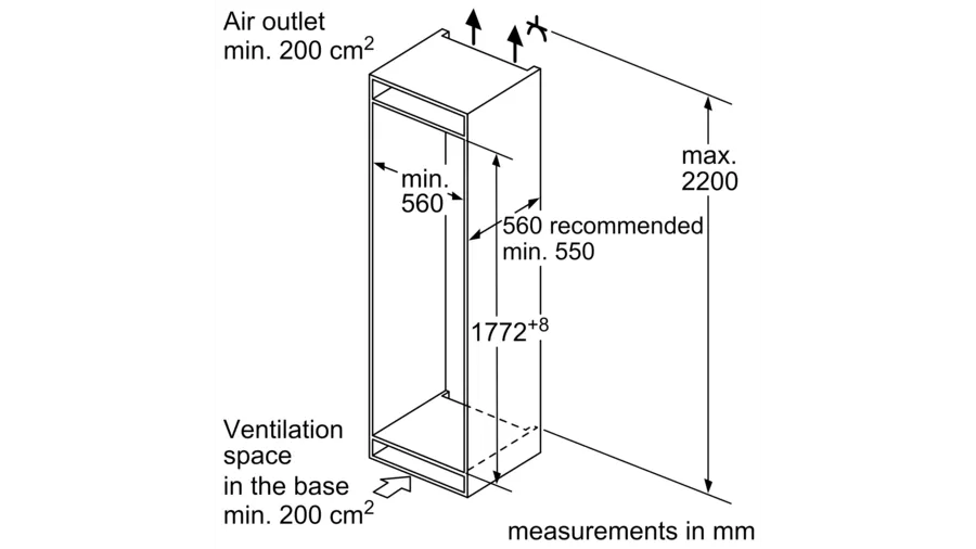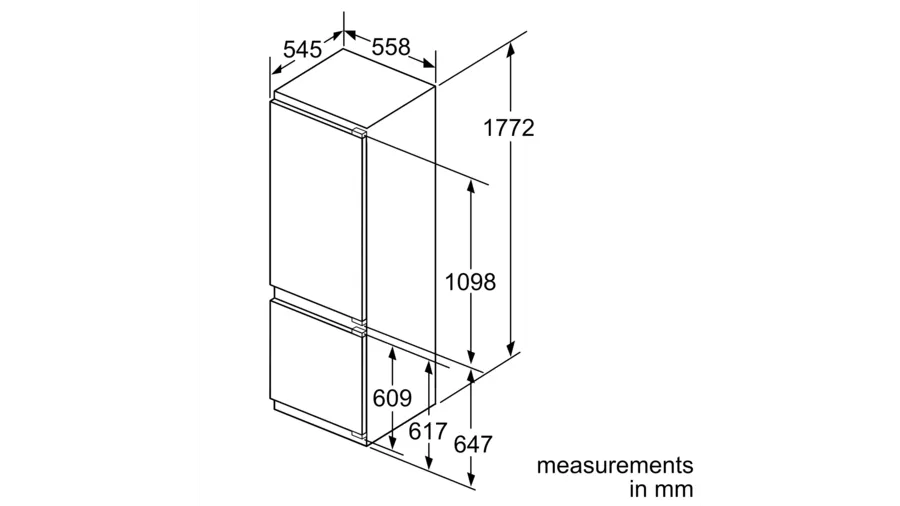 Key Features: Bosch Integrated Upright Fridge, 177.5 x 56cm, Fixed Hinge | Serie 6 | KIR81AFE0G LED lights bring a completely new lighting concept to fridges VarioZone: more flexibility due to variable-use glass shelves and drawers in the freezer compartment Automatic super freezing: for freezing smaller food loads faster whilst protecting your frozen items from defrosting, thanks to the detection of temperature increase BigBox frozen food drawer: for stacking storage containers or for large frozen food items EasyAccess Shelf: retractable glass shelf for convenient loading and unloading and a perfect view 319 Litres of usable space, 209 litres in the fridge and 61 litres in the freezer 80/20 Split with reversible door hinges and door-on-door assembly 2 year warranty for peace of mind Dimensions (mm): H1772 x W558 x D545 5 Fridge shelves, 1 VitaFresh fruit and veg drawer, 2 freezer drawers