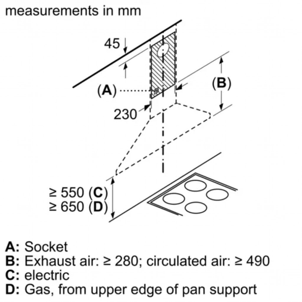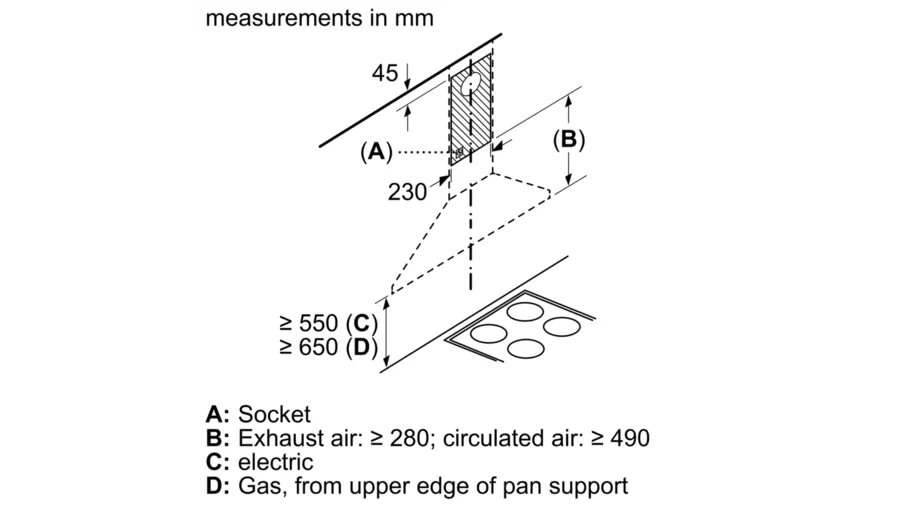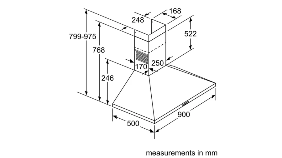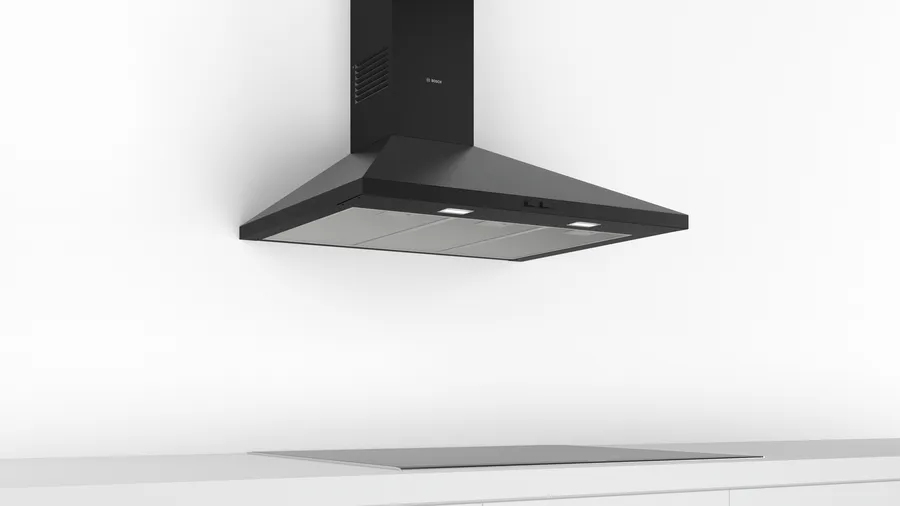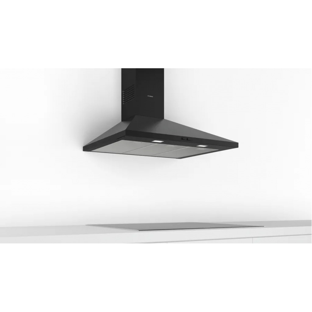Bosch Series 2 Wall-Mounted Cooker Hood 90 cm DWP94BC60B – Black Designed for wall mounted installation Suitable for ducted or recirculating operation Twin channel high-performance fan motor Switch control for extractor speeds and light 3-speed operation Maximum extraction of 410 m3/h 2 x high volt halogen. light E14 30W Removable metal grease filters, dishwasher safe Rocker switch control for extractor speeds and light 3 power levels 2 x 40W Light 3 removable metal grease filter cassettes An impressive extraction rate of 410 m3/h ensures this hood will have your kitchen odour free in no time Halogen lighting provides energy efficient and bright lighting of the hob area 90 cm wide Height adjustable chimney sections Brand ‎Bosch Electroménager Model ‎DWP94BC60 Product Dimensions ‎50 x 90 x 79.9 cm; 10 Kilograms Item model number ‎DWP94BC60 Energy Efficiency ‎C Efficiency (10 classes) ‎A+++ to D Annual Energy Consumption ‎53 Kilowatt Hours Per Year Noise Level ‎65 dB Installation Type ‎Pyramid Part Number ‎DWP94BC60 Colour ‎Black Voltage ‎220 Volts Wattage ‎100 watts Number of Vents ‎3 Batteries Required? ‎No Weight ‎10 Kilograms Counter Depth ‎500 Millimetres The Bosch wall hood has been specially designed to reduce the volume to a minimum. Perfect for open kitchens. The cooker hood is so quiet you’ll forget it works. The pyramid shape makes it elegant and fits easily into any kitchen. The cooker hood is equipped with LED lighting that provides perfect and refined lighting throughout the kitchen. Low power consumption, also guarantees a longer life than conventional incandescent or halogen bulbs. The cooker hood can be installed on a drain to ensure optimal air quality in your kitchen. Box contents: 1 x Bosch pyramid wall cover. Dimensions (L x D in mm): 900 x 500, chimney height: 799 to 975 mm. With standard accessories: 3 metal grease filters, connection cable 1.3 m. Colour: black Key Features: Bosch Series 2 Wall-Mounted Cooker Hood 90 cm DWP94BC60B – Black Silent: maximal extractor performance with little noise LED-Illumination: The energy-saving lighting provides white and good lighting for the hob area. 3-Speed Power Level Options To Suit Your Cooking Style Ducted or Non-ducted Options Extraction rate: at 440 m3/h, it quickly ensures optimal kitchen air quality. Halogen lighting: for optimal, energy-efficient illumination of the hob. Suitable for ducted or re-circulated extraction For recirculated extraction or CleanAir recirculation kit (accessory) needed Twin channel high performance fan motor Rocker switches for extractor speeds and light 3 speeds control Metal grease filter, dishwasher safe