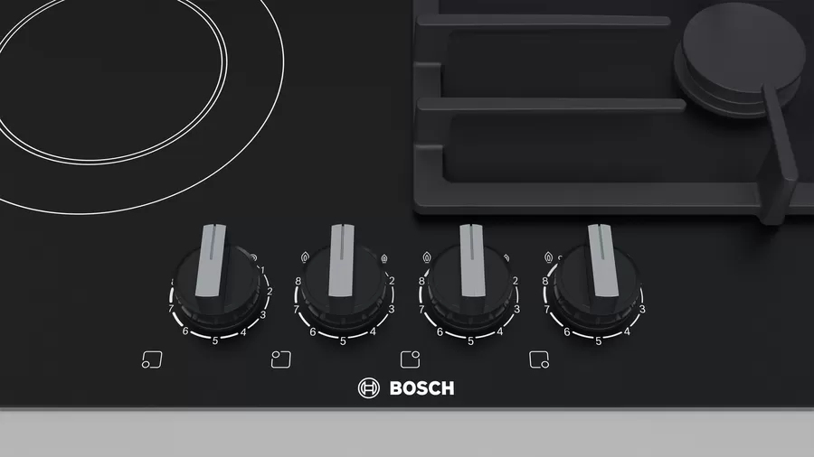 Key Features: Bosch PRY6A6B70 3 Gas +1 Electric Built In Hob, 60cm, Front Knobs – Black 3 gas burners and 1 electric cooking zone 1 high speed, 1 standard, 1 economy burner, 1 hotplate 1-hand ignition Flame failure safety device 1 stage residual heat indicator Black cast iron pan supports Electrical cable length 1 m