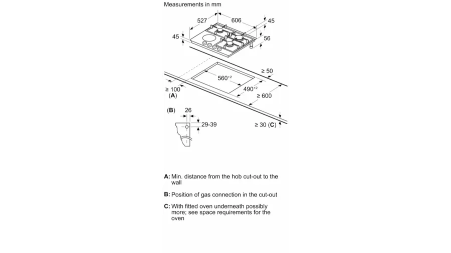 Bosch PRY6A6B70 Serie 8 60cm Ceramic 3 Gas + 1 Electric Built In Hob 3 Gas burner 1 High Speed 2.8kW 1 Standard 1.8kW 1 Eco burner 1.1kW 1 Electric dual circuit zone FlameSelect Digital display to indicate selected power level Electronic ignition via front controls 4-fold residual heat indicator Flame failure device Cast iron pan supports (dishwasher safe) HEZ298105 Simmer Plate : Accessory Overall: (H x W x D): 4.5 x 60.6 x 52.7cm Aperture: (H x W x D): 4.5 x 56.0-56.2 x 49.0-50.2cm Rating: 1800W