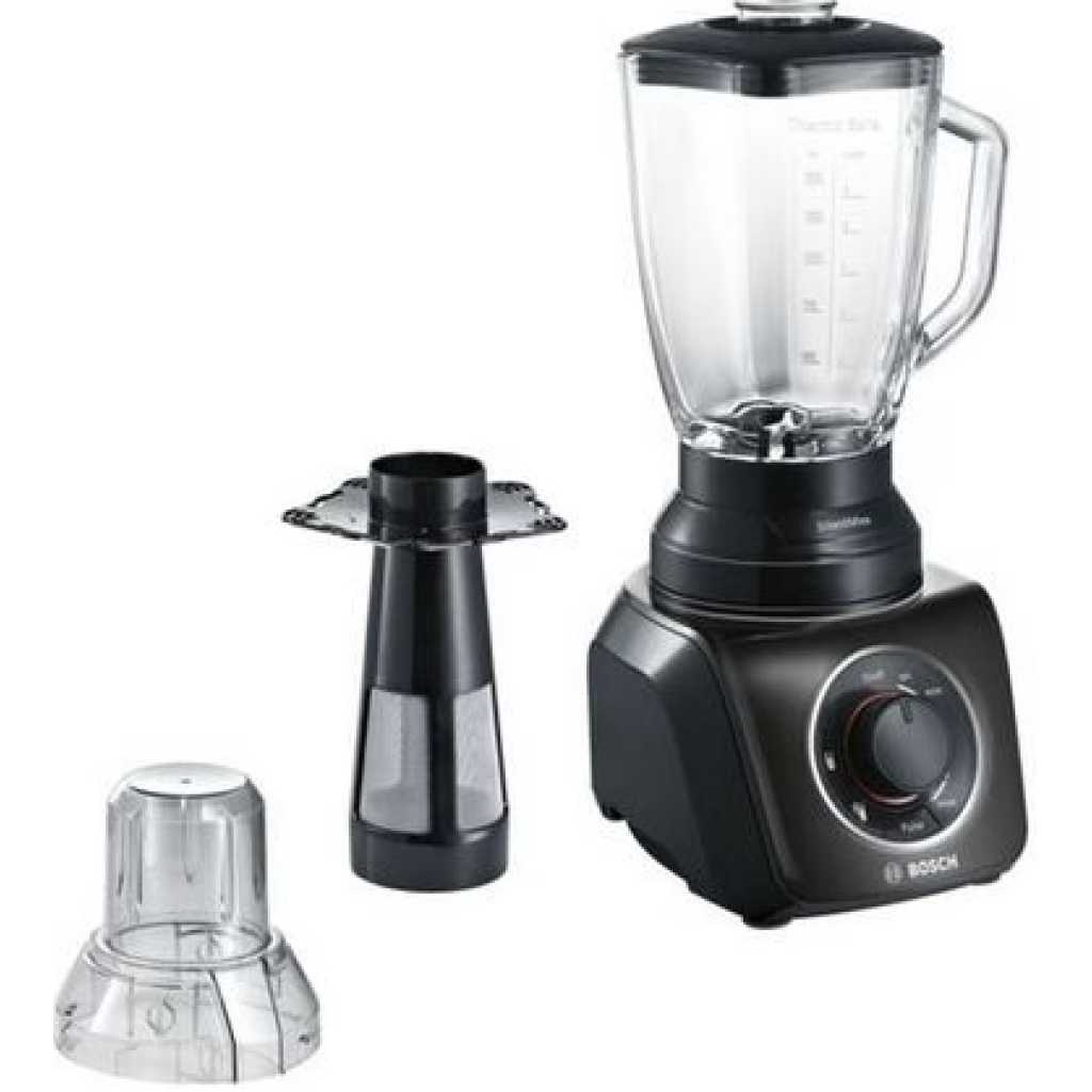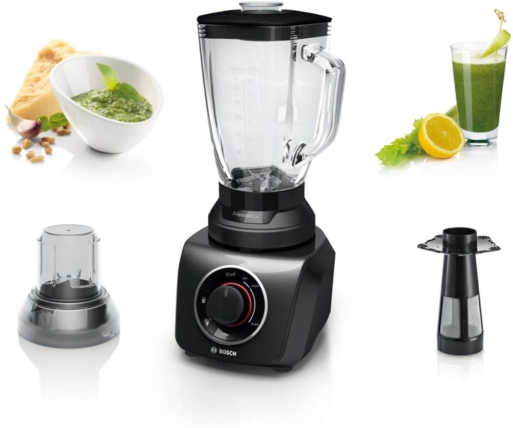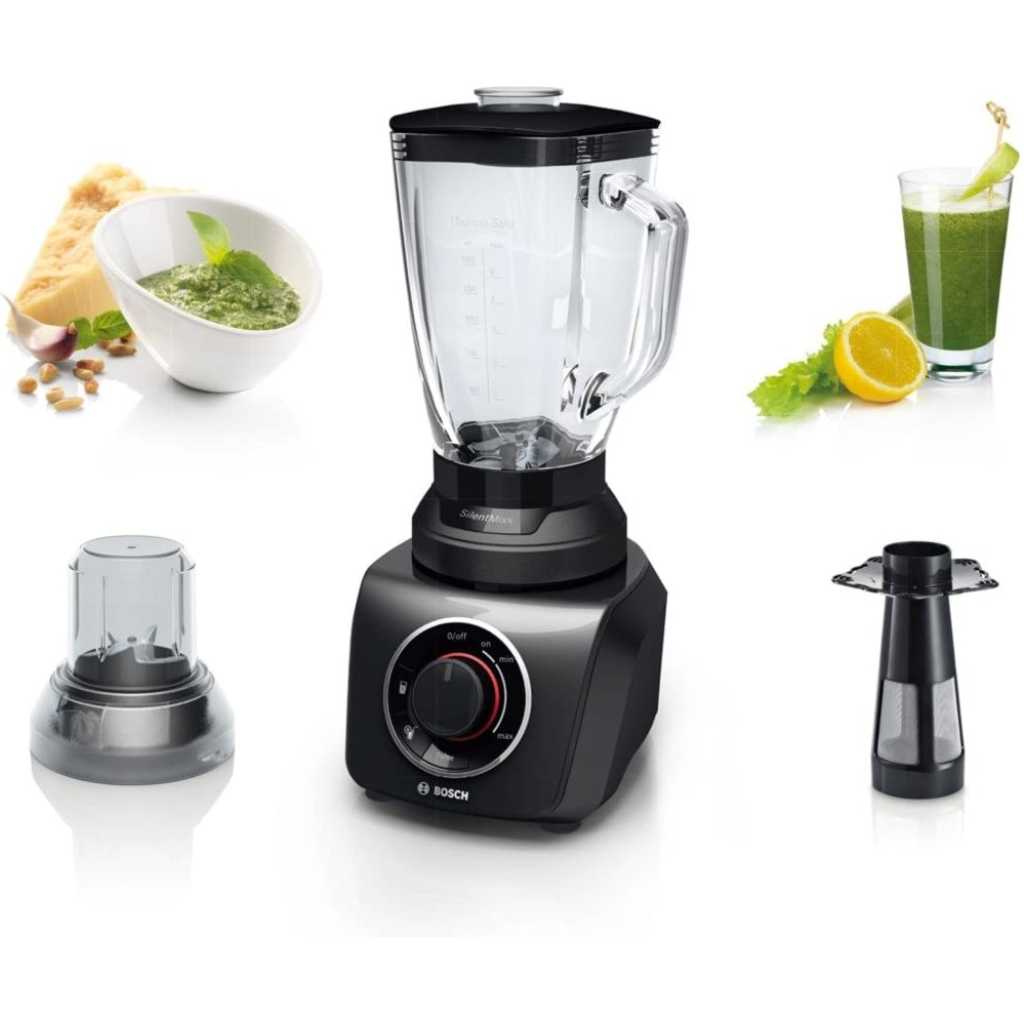 Bosch SilentMixx MMB43G3BGB Blender 700 W, 1.5 Litre – Black The Bosch SilentMixx chops, mixes and blends ingredients of your choice quickly, reliably and, above all, more quietly than other blenders. With a ThermoSafe glass jug (2.3 Litre) allowing you to mix hot soups and ice-cold drinks safely. Using the VitaBar App, it offers the perfect inspiration for your healthy lifestyle with lots of recipes Box Contains 1 x Bosch MMB43G3BGB SilentMixx Blender 1 x 1.5 L glass jug 1 x Smoothie filter 1 x 400 ml chopper attachment 1 x 50 ml measuring cup