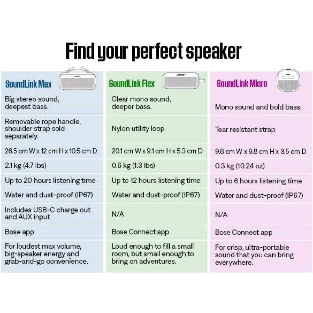 Key Features: MUSIC CALLS: The Bose SoundLink Flex Portable Bluetooth Speaker (2nd Gen) packs big, bold sound in a portable size that’s perfect for sharing tunes and good times anywhere on your travels SOUND THAT TAKES YOU PLACES: Take advantage of the surprisingly powerful performance of this Bose wireless speaker with its clear, balanced, high-fidelity audio and deep bass that is easy to take with you PERFECTLY PORTABLE, WITH BATTERY LIFE TO MATCH: This Bluetooth speaker is small enough to fit in your hand or clip onto a bag using the utility loop, plus it has up to 12 hours of battery life* so you can focus on the fun at the beach, hikes, or pool TOSS IT, DROP IT, IT’S ALL GOOD: This IP67 rated Bose portable Bluetooth speaker is waterproof and dustproof and is wrapped in a durable, silicone-wrapped body to withstand drops, shocks, and rust STEREO ON THE GO: Amp up the adventure with more sound when you link two compatible Bose speakers, choose Stereo Mode for left and right channels, or go for Party Mode for even bigger, bolder sound PLAYS FROM ANY POSITION: Stand it up, lay it back, or hang it in the shower, this small Bluetooth speaker uses PositionIQ technology to sense the speaker orientation and automatically adjusts for the best sound possible STAY CONNECTED WITH ADVANCED BLUETOOTH 5.3: This outdoor speaker uses Bluetooth 5.3 to ensure a continuous connection to your device from up to 30 feet away and can pair to multiple devices at once using multipoint technology