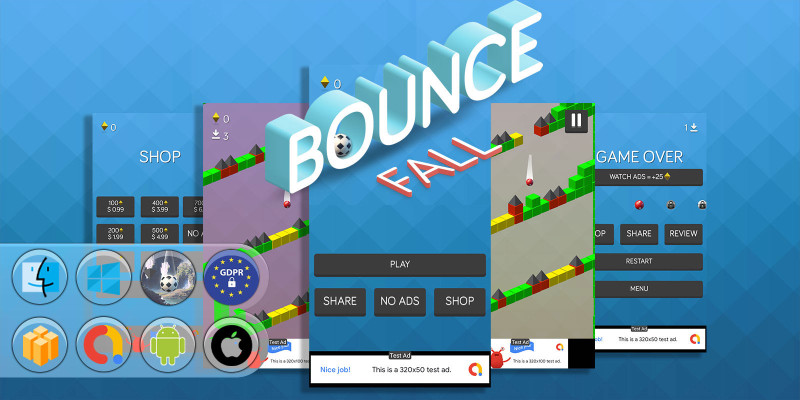 Bounce Fall - Buildbox Template. Touch and move characters to break platforms, avoid spikes, collect diamonds, and survive endless bouncing fun.