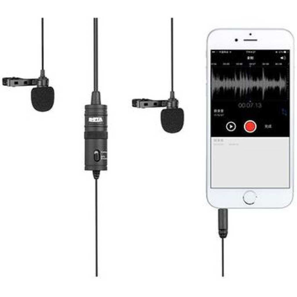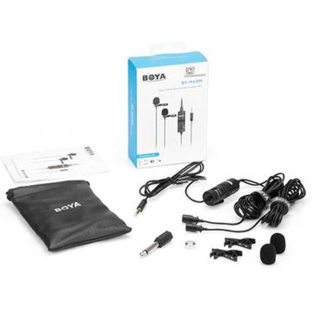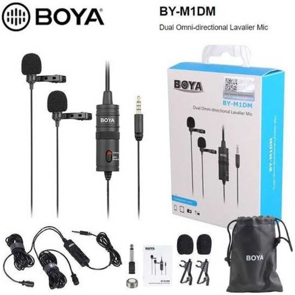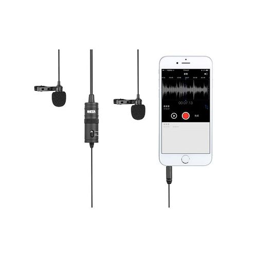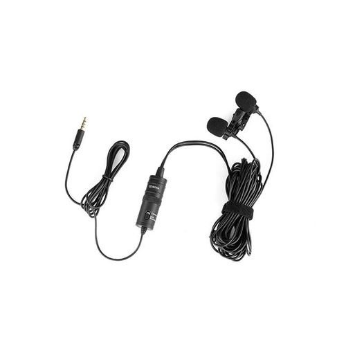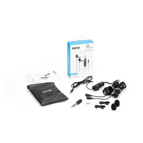 Boya BY-M1DM Plastic Microphone Dual Omni Directional Lavalier Mic With Two Small Clip And Two Foam Windscreen For Smart Phone – Black The BOYA BY-M1DM Dual Omnidirectional Lavalier Microphone features two lav mics attached to a single 3.5mm TRRS connector, making it easy to record two people at the same time to your smartphone, DSLR/mirrorless camera, camcorder, recorder, computer, or similar device. Great for interviews, the mics feature forgiving, omnidirectional pickup patterns that help maintain consistent audio levels, even when the speaker turns away from the microphone. Each mic is routed to a discrete channel, allowing you to adjust the individual levels later in your editing software for just the right balance. The 74 dB signal-to-noise ratio helps cut down on noise and hiss for more professional-sounding recordings. Powered is supplied by your smartphone or by the included LR44 battery if you’re recording to a camera. Two foam windscreens and two lapel clips to attach the mics to clothing are also included, along with a carrying pouch. For Phones, Mobile Devices & Cameras Record 2-Person Interviews on 1 Device Two Omnidirectional Condenser Mics 3.5mm TRRS Connector Power Supplied by Smartphone LR44 Battery Included for Camera Use Includes Lapel Clips Includes Foam Windscreens Key Features: Boya BY-M1DM Plastic Microphone Dual Omni Directional Lavalier Mic With Two Small Clip And Two Foam Windscreen For Smart Phone – Black Dual-mic design for two speakers. • Work with cameras, smartphones, and computers. • Ideal for interviews, dialog, podcasting live streaming, etc. • Omnidirectional polar pattern. • Improved signal-to-noise ratio. • With 4m(13’) length cable. • Foam windscreen, lapel clip, 1/4” adapter and LR44 battery included.