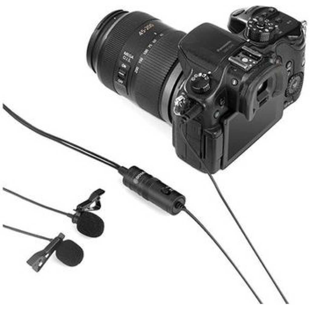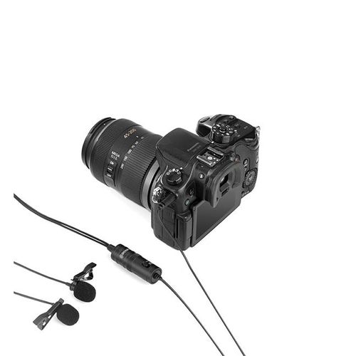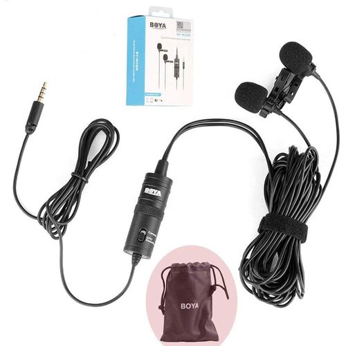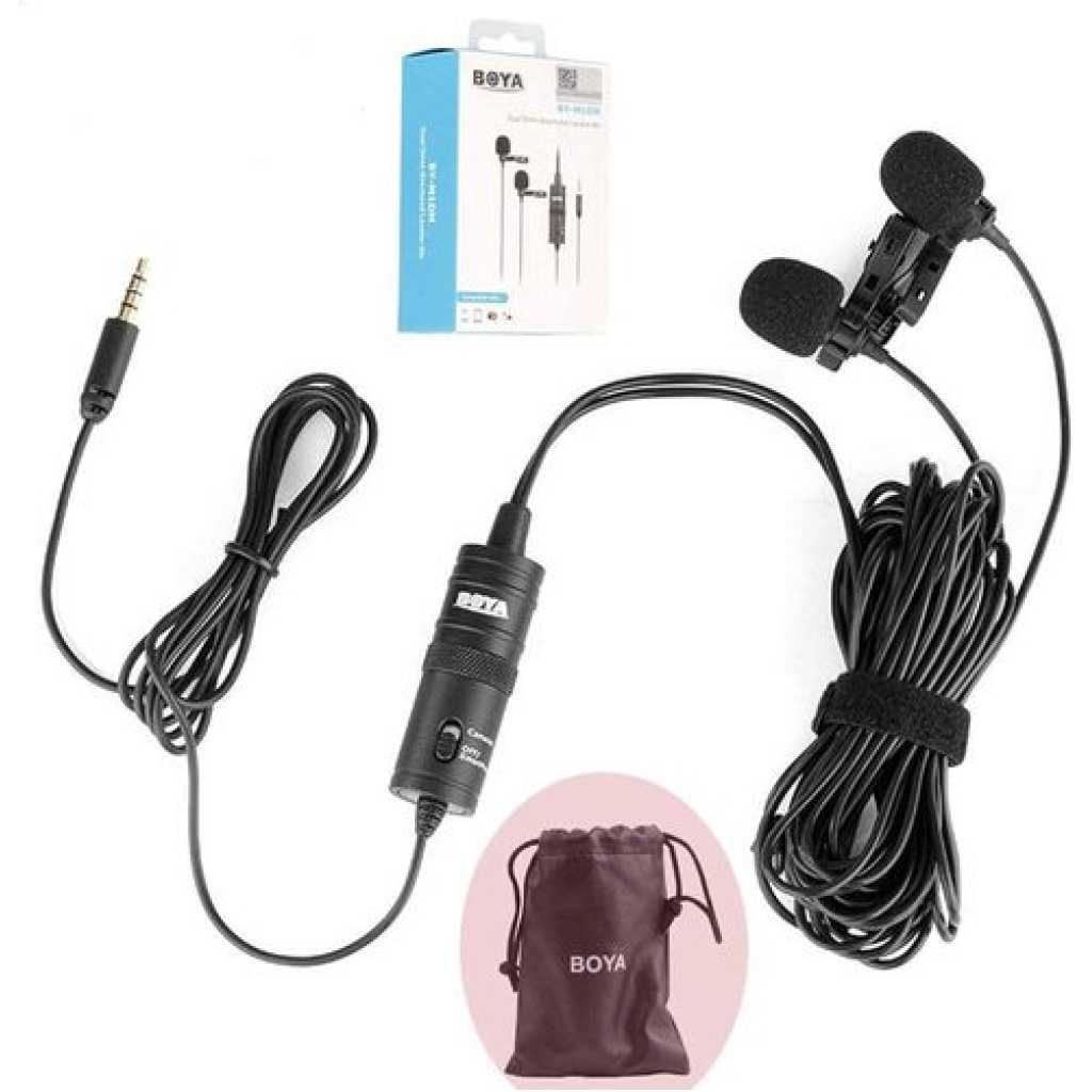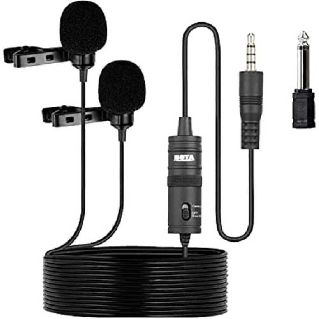 Boya BY-M1DM Plastic Microphone Dual Omni Directional Lavalier Mic With Two Small Clip And Two Foam Windscreen For Smart Phone – Black The BOYA BY-M1DM Dual Omnidirectional Lavalier Microphone features two lav mics attached to a single 3.5mm TRRS connector, making it easy to record two people at the same time to your smartphone, DSLR/mirrorless camera, camcorder, recorder, computer, or similar device. Great for interviews, the mics feature forgiving, omnidirectional pickup patterns that help maintain consistent audio levels, even when the speaker turns away from the microphone. Each mic is routed to a discrete channel, allowing you to adjust the individual levels later in your editing software for just the right balance. The 74 dB signal-to-noise ratio helps cut down on noise and hiss for more professional-sounding recordings. Powered is supplied by your smartphone or by the included LR44 battery if you’re recording to a camera. Two foam windscreens and two lapel clips to attach the mics to clothing are also included, along with a carrying pouch. For Phones, Mobile Devices & Cameras Record 2-Person Interviews on 1 Device Two Omnidirectional Condenser Mics 3.5mm TRRS Connector Power Supplied by Smartphone LR44 Battery Included for Camera Use Includes Lapel Clips Includes Foam Windscreens Key Features: Boya BY-M1DM Plastic Microphone Dual Omni Directional Lavalier Mic With Two Small Clip And Two Foam Windscreen For Smart Phone – Black Dual-mic design for two speakers. • Work with cameras, smartphones, and computers. • Ideal for interviews, dialog, podcasting live streaming, etc. • Omnidirectional polar pattern. • Improved signal-to-noise ratio. • With 4m(13’) length cable. • Foam windscreen, lapel clip, 1/4” adapter and LR44 battery included.
