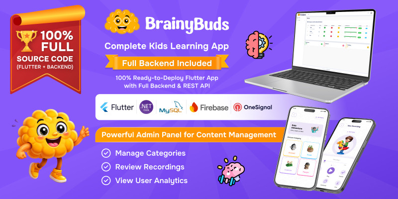 BrainyBuds App Flutter. A full-featured, interactive kids learning app built in Flutter with a comprehensive .NET 9.0 admin panel and API.