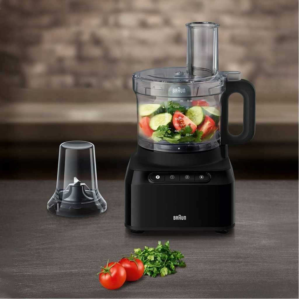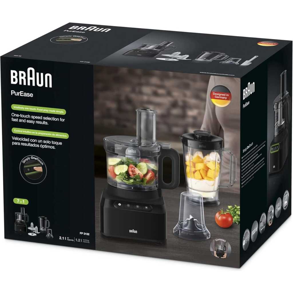 Key Features: Braun FP 3132 PurEase Food Processor. 800 Watts 1.2 L Blender 2 speeds + Pulse 2.1 L Bowl capacity Whipping/blending Dough/kneading tool Multi Mill and Spatula Plastic food processor bowl Dishwasher safe Fast, slow, pulse, and stop function Emulsifying disc 4 mm cutting and rasping disc