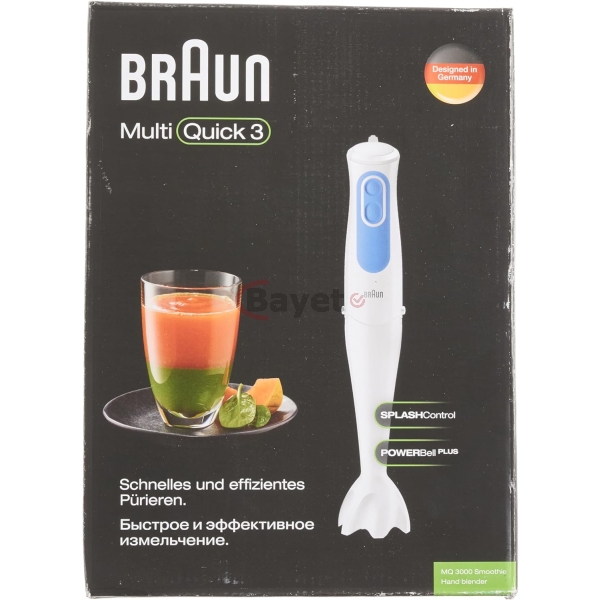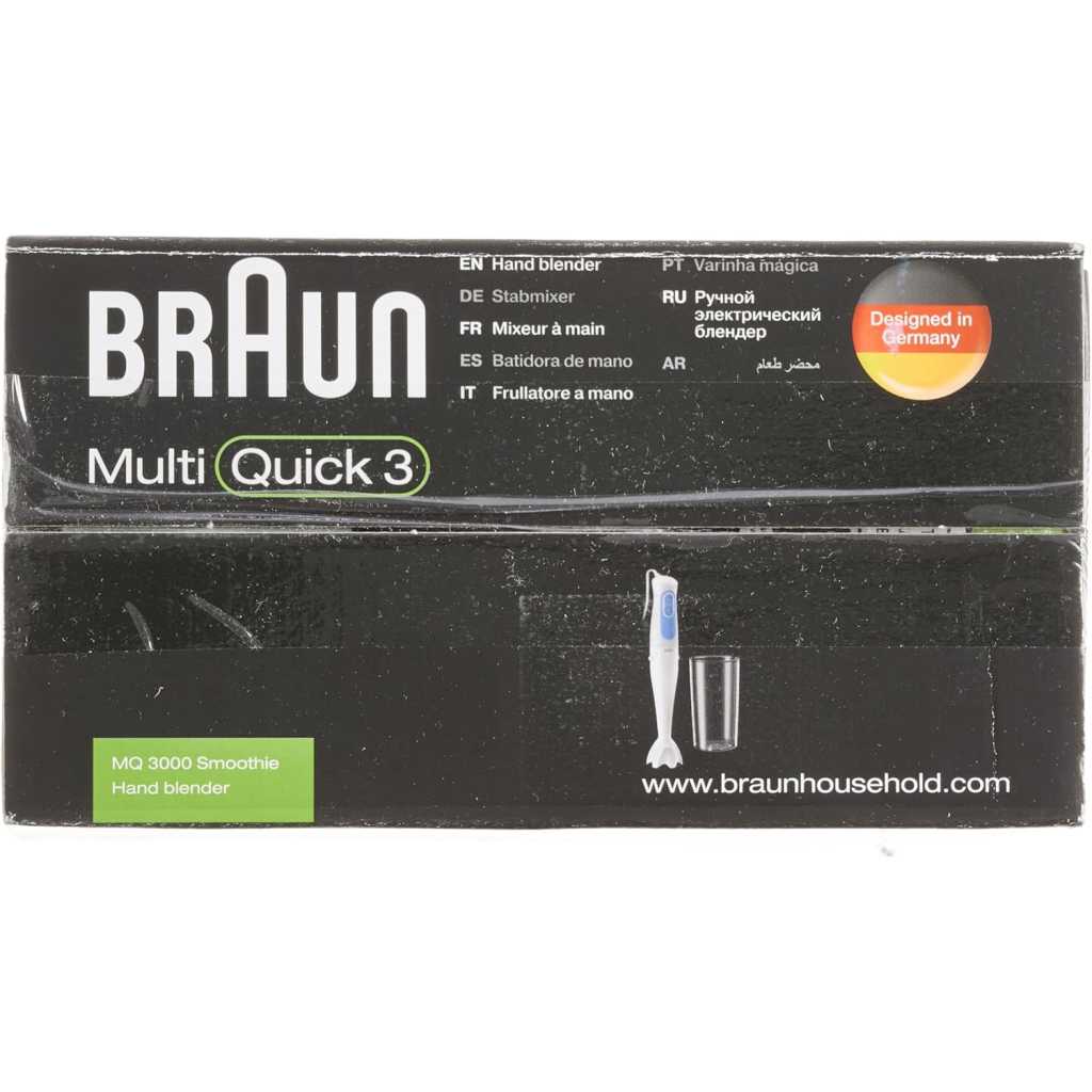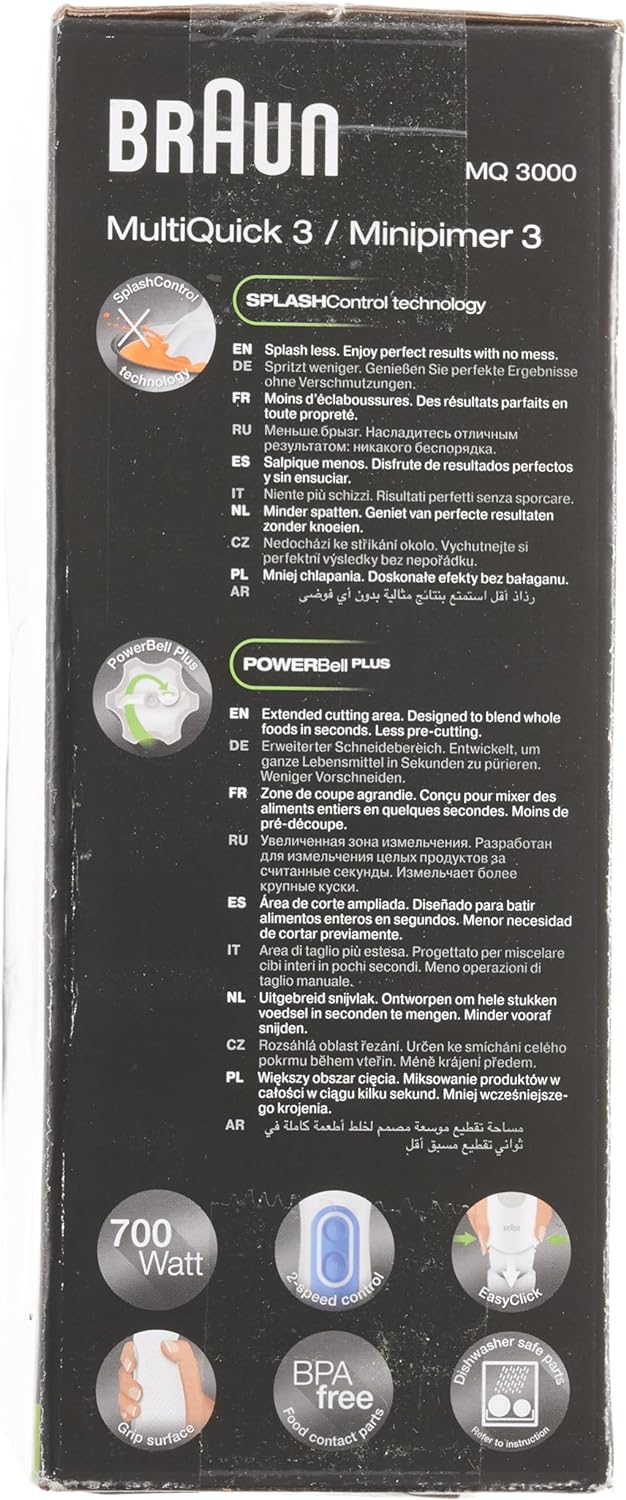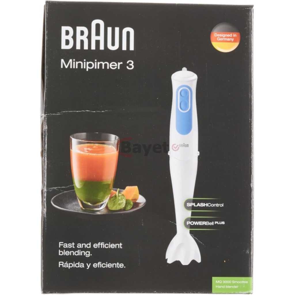 Key Features: Braun Hand Blender MQ3000 | 700W w/ Plastic Beaker. White color Plastic material Brand: Braun 700 W Plastic Minipimer Fast & efficient blending PowerBell Technology for finer & more even results Simple 2-speed activation Splash control technology