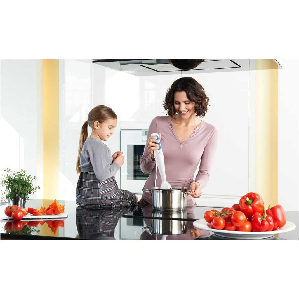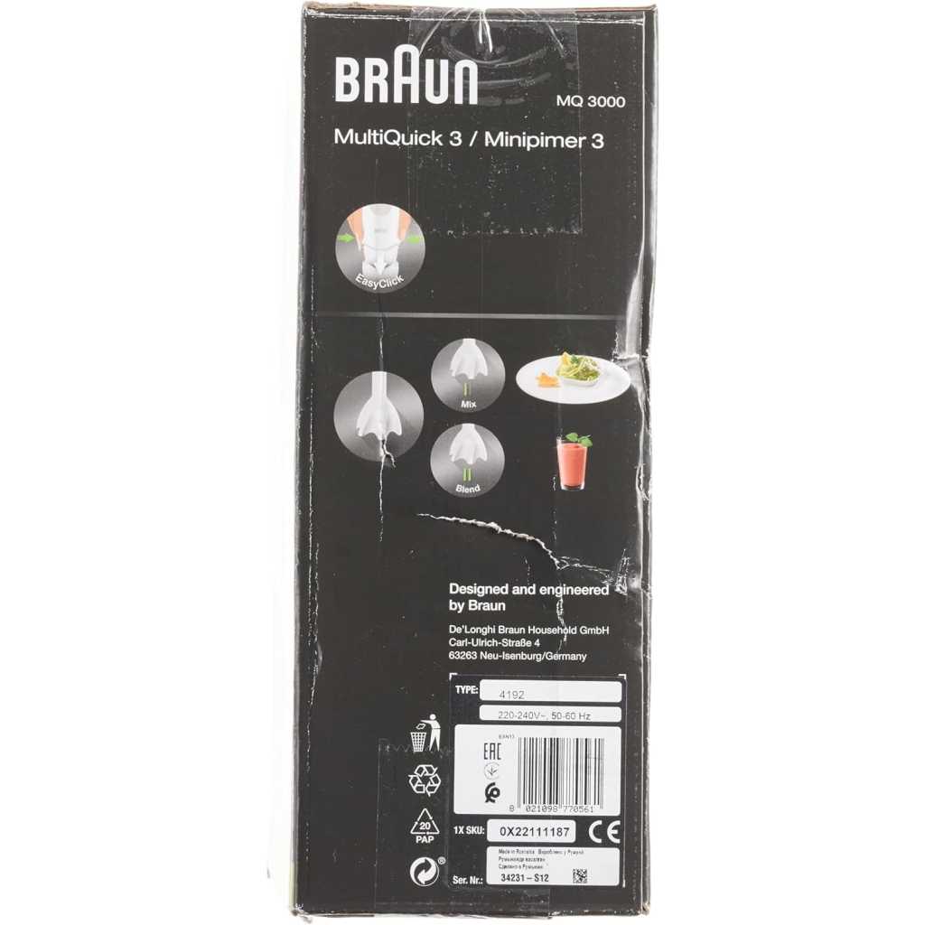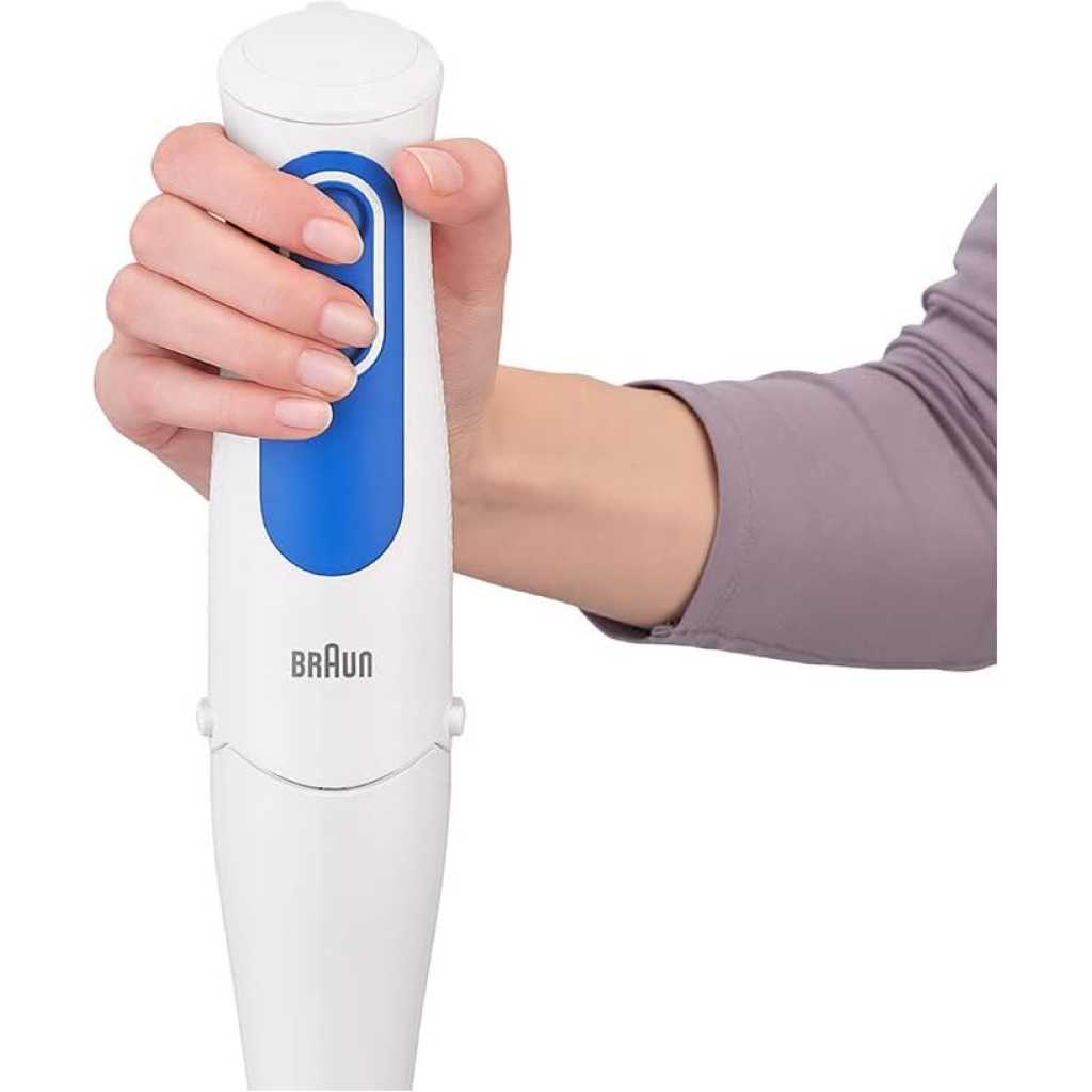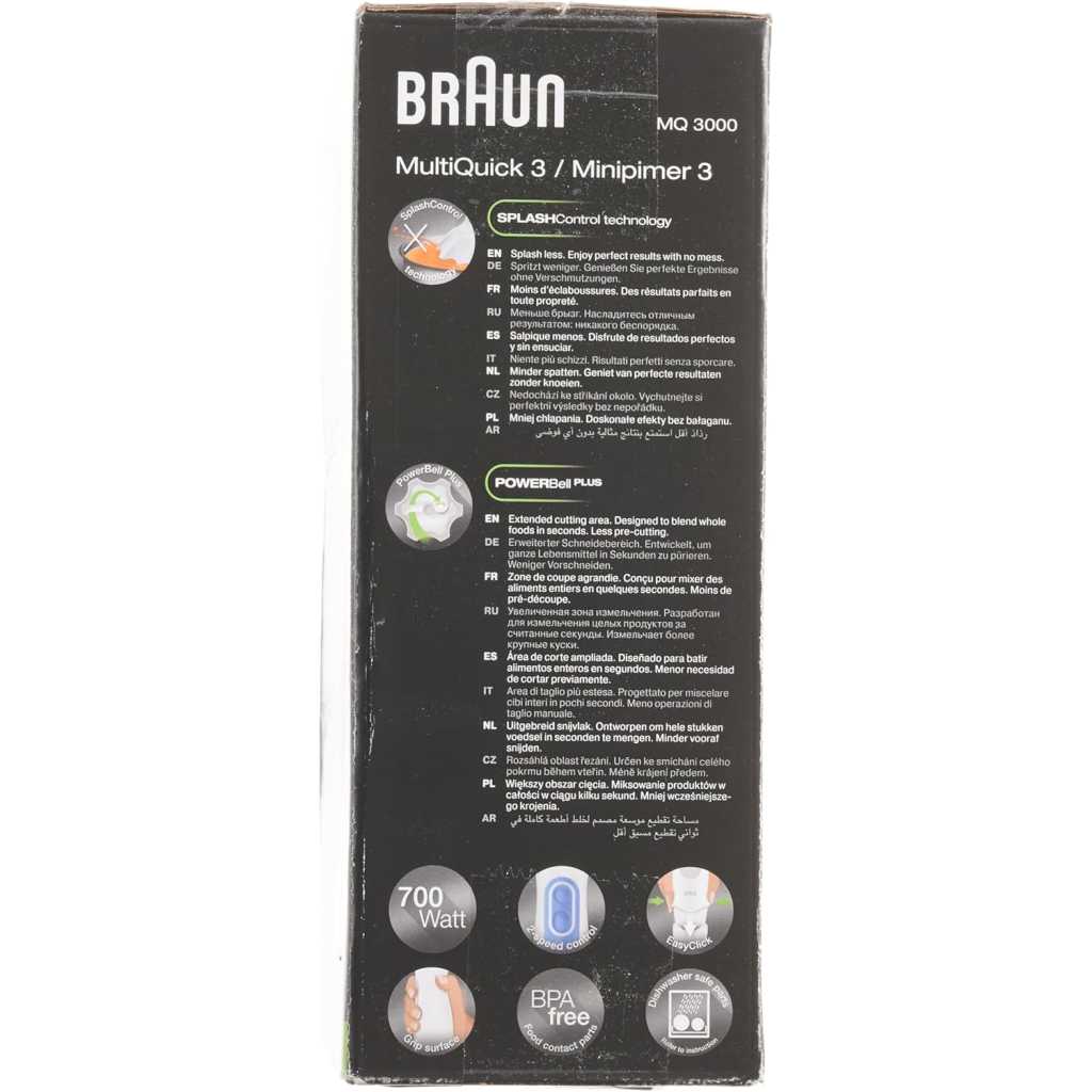 Key Features: Braun Hand Blender MQ3000 | 700W w/ Plastic Beaker. White color Plastic material Brand: Braun 700 W Plastic Minipimer Fast & efficient blending PowerBell Technology for finer & more even results Simple 2-speed activation Splash control technology