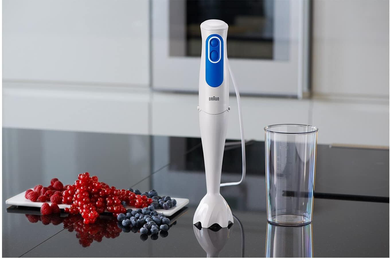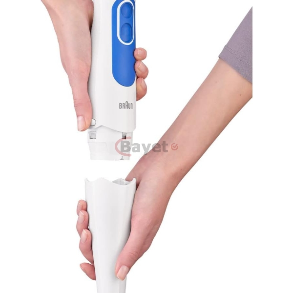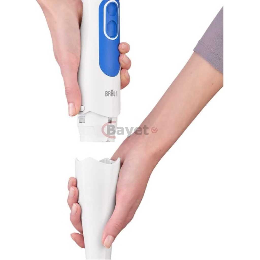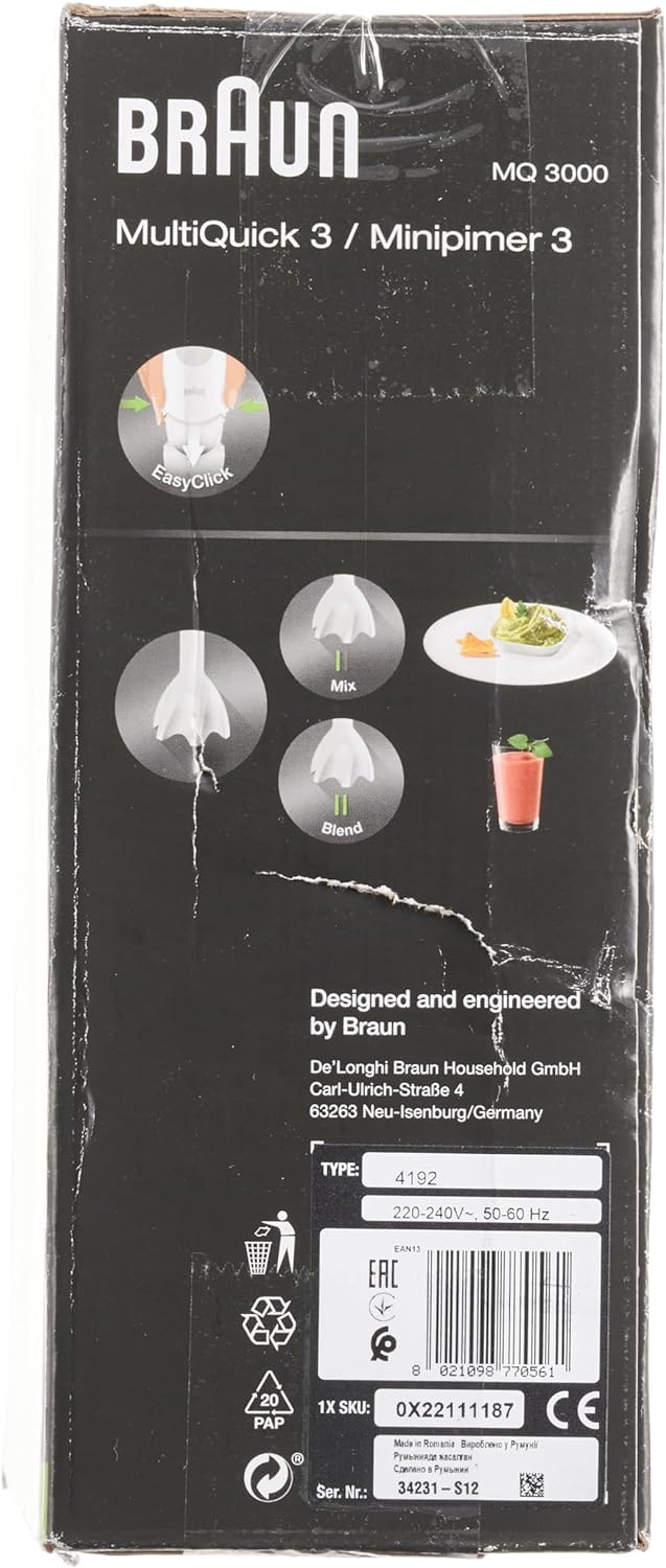 Braun Hand Blender MQ3000 | 700W w/ Plastic Beaker. White color Plastic material Brand: Braun 700 W Plastic Minipimer Fast & efficient blending PowerBell Technology for finer & more even results Simple 2-speed activation Splash control technology