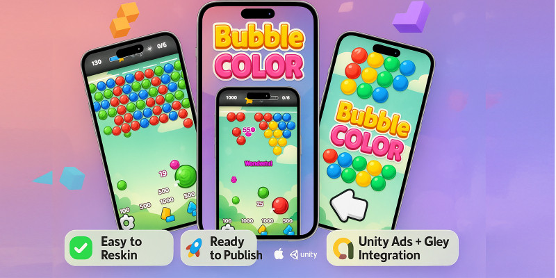 Bubble color - Casual Mobile Unity Game. Casual Unity Game Source Code! Perfect for mobile, this game is optimized for Android & iOS. Built in Unity, easy to reskin