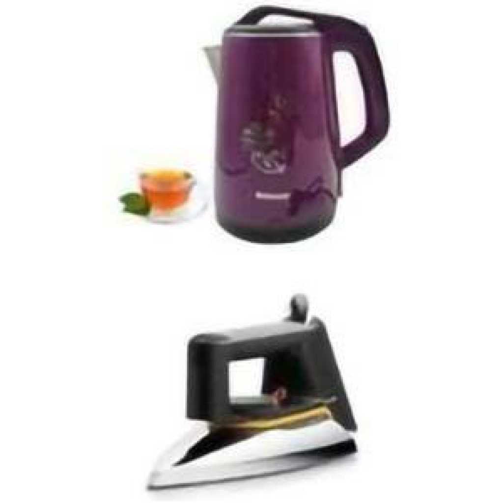 Bundle Of Flat Iron & Marado 2.5L Percolater- Multicolour Saachi Non-Stick Dry Flat and Marado electric kettle 2.5 litres SAACHI FLAT IRON Fast and efficient – guaranteed With a speed-shaped sole plate. Pointed tip for ironing tricky areas. The uniquely pointed tip allows you to iron even the hardest-to-reach areas. Nonstick soleplate coating: Nonstick soleplate coating. The sole plate of your Philips iron is coated with a special nonstick layer for good gliding performance on all fabrics. Iron temperatures ready light: Iron temperature ready light. The indicator light goes off when the required ironing temperature has been reached. Button groove speeds up ironing along buttons and seams. The button groove makes ironing along buttons and seams fast and easy MARADO ELECTRIC KETTLE 2.5LITRES The inner cover is steel designed, safe and secure. Non-slip grip, soft touch, comfortable angle, to prevent hand sliding. The high-quality stainless steel spout prevents scale into the cup to ensure clean water. Automatic cut-off switch and Intelligent temperature control system. SPECIFICATION Power: 2000 watts Water level indicator Automatic shutdown Body Material: Aluminium Heater element material: Stainless steelChoose from a wide range of Unique products on TilyExpress and enjoy convenient and secure online shopping, delivery, guaranteed products and competitive pricing. Key Features: Bundle Of Flat Iron & Marado 2.5L Percolater- Multicolour Color: Silver, Grey Voltage: 220V Non-stick soleplate coating Pointed tip for ironing tricky areas Button groove speeds up ironing along buttons and seams Marado electric kettle Capacity 2.5 litres Power supply via base plate Concealed heating element Multi-level protection system