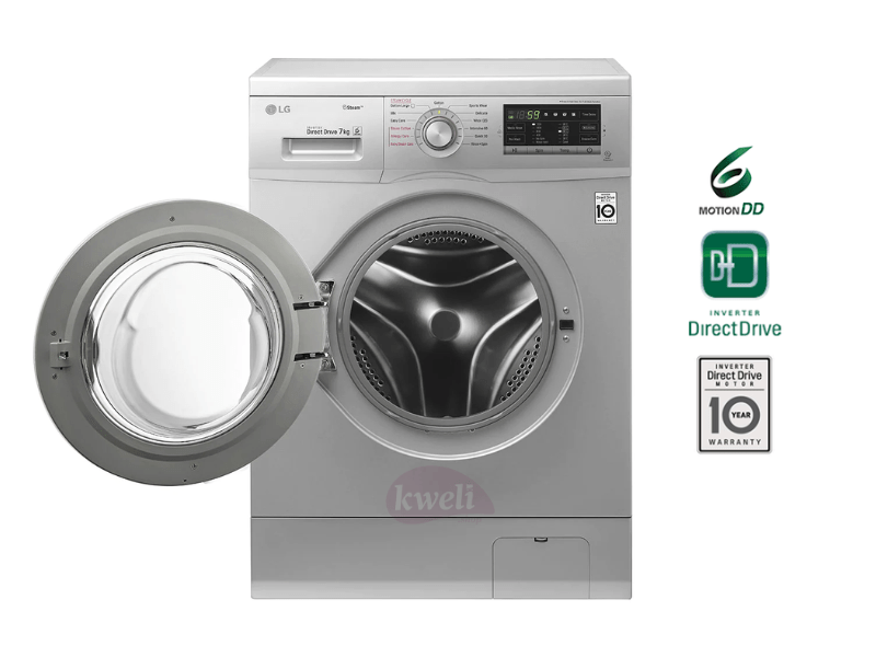 LG 7kg Washing Machine Front Loading washing machine 1200 Rpm Inverter Direct Drive Motor 6 Motion Technology Smart Diagnosis Steam Function 13 Wash Programs (3 Steam, 10 Non-Steam) Steam Programs (Steam Cotton, Allergy Care, Baby Steam Care) Non-Steam Programs (Cotton, Cotton Large, Mix, Easy Care, Sports Wear, Delicate, Wool, Intensive 60, Quick 30, Rinse & Spin) Additional Options (Medic Rinse, Pre-Wash, Time Delay, Intensive, Crease Care, Tub Clean) 6 Spin Options (Rinse Hold, No Spin, 400, 800, 1000, 1400) 6 Temperature Options (Cold, 20, 30, 40, 60, 95) Child Lock Emergency Drain Filter Silver Finish | #KweliGotYou| Order LG 7kg Front Load Washing Machine FH2J3QDNG5P; 1200 rpm, Steam Option, 6 Motion Inverter Direct Drive, online and enjoy free delivery across Uganda > Long warranty > Lifetime After-sales Support
