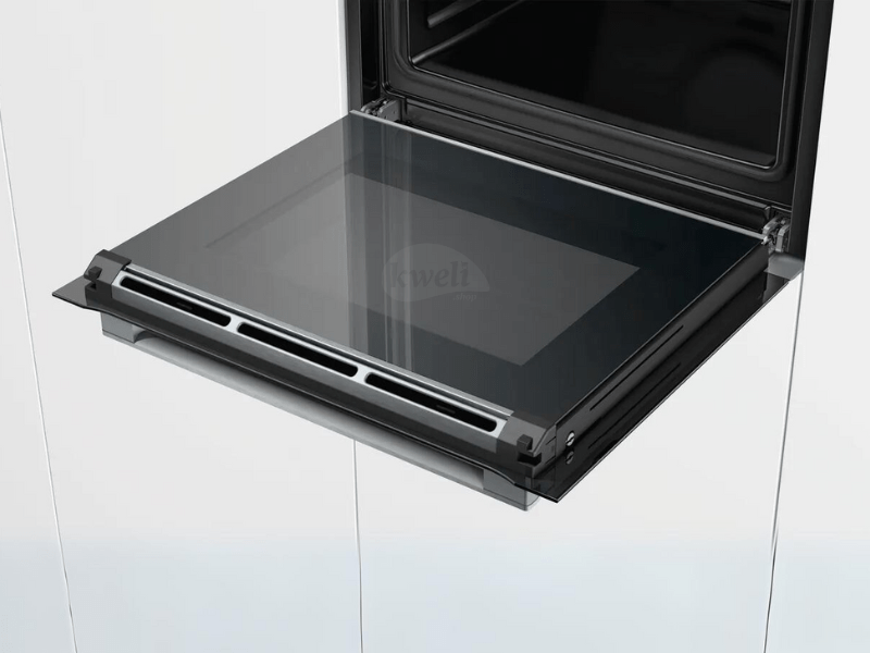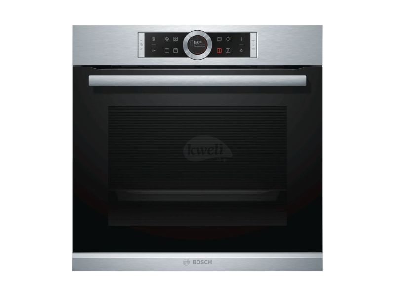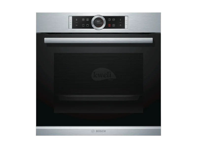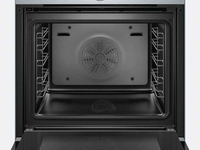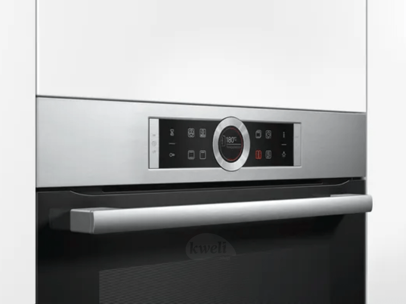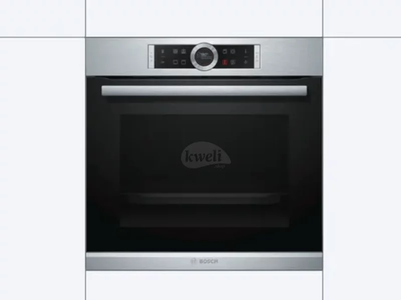 Bosch Built-In Multi-function Oven Electric HBG634BS1B 4D Hotair: even heat distribution for perfect results – on any level. TFT display control: easy to use thanks to the control ring with full text and symbols. EcoClean Direct: less cleaning effort thanks to a special coating of the rear wall that automatically absorbs grime. Cleaning Assistance: less cleaning effort thanks to the new cleaning option, which can be especially used for cleaning light soiling. Drop Down Door with SoftOpen and SoftClose: the oven door opens and closes gently and quietly Usable volume (of the cavity) - NEW (2010/30/EC); 71 litres Range of temperature; 30-300 °C Cooking method; 4D Hotair, Defrost, Full-width grill, Hot Air-Eco, Half width grill, Conventional heat, Pizza setting, low-temperature cooking, Bottom heat, Hot air grilling, pre-heating, warming Door hinge: damped, Bottom Safety device: childproof lock, Residual heat indicator, Safety switch-off func oven, start button, Door contact switch Connection rating: 3600 watts Pizza setting Hotair: 4D (even heat distribution on any level ) Included accessories: 2 x combination grid, 1 x universal pan | #KweliGotYou| Order Bosch 60cm Built-In Multi-function Oven HBG634BS1B; Stainless steel, 71 litres online and enjoy free delivery across Uganda > Long warranty > Lifetime After-sales Support