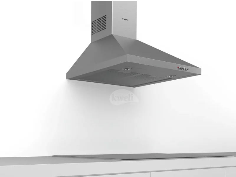 Bosch 60cm Wall-mounted Cooker Hood Silent: maximal extractor performance with little noise Extraction rate: at MAX_FOERDERLEISTUNG m3/h, it quickly ensures optimal kitchen air quality. Metal grease filters: filter grease and other solid particles out of the extracted air Pi-shaped double metal filter Colour: Stainless steel Installation typology: Wall-mounted Total power of the motors: 125 watts Number of speed settings: 3 Grease filter material: Washable aluminium Energy efficiency class: D Sound power at max. speed (recirculation): 70 dB Total annual energy consumption: 72.8 kWh/annum | #KweliGotYou| Order Bosch 60cm Wall-mounted Cooker Hood DWP64CC50Z; Electric Chimney Hood, Grease Filter, Stainless Steel online and enjoy free delivery across Uganda > Long warranty > Lifetime After-sales Support