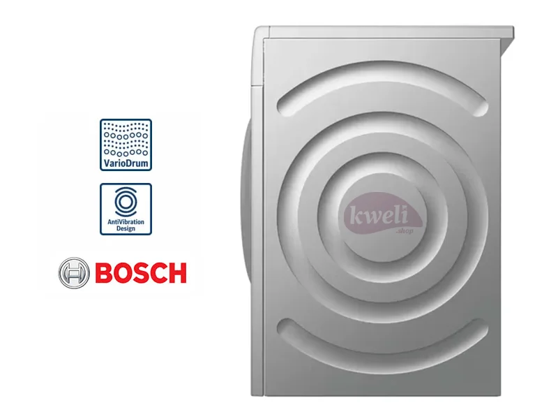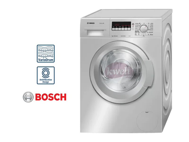 BOSCH 7kg Front Load Washing Machine WAK2427SKE Outstanding washing results thanks to optimum water distribution ActiveWater Plus: Save money and protecting the environment thanks to efficient water management. Loading capacity: 7kg Energy efficiency rating: A+++ Max. spin speed: 1,200rpm Reload function Cottons programme: Pre-Wash, Standard cold - 90°C Easy-care program: 30° prewash, Standard cold - 60°C Energy consumption annual: 174.00 kWh/annum Housing in silver inox FREE Installation (Kampala, Wakiso and Mukono districts) | #KweliGotYou| Order BOSCH 7kg Front Load Washing Machine WAK2427SKE; Serie | 4 Washing Machine, Pre-Wash, VarioDrum, ActiveWater Plus, ActiveVibration Design 1200rpm, Silver inox online and enjoy free delivery across Uganda > Long warranty > Lifetime After-sales Support