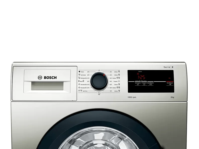 BOSCH 8kg Front Load Washing Machine WAJ2018SKE Rated capacity: 8 kg Energy Efficiency Class: A+++ Energy consumption 157 kWh per year, based on 220 standard washing cycles for cotton programmes at 60°C and 40°C at full and partial load, and the consumption of the low power modes. Actual energy consumption will depend on how the appliance is used. energy consumption of the standard 60 °C cotton programme 0.92 kWh at full load and 0.72 kWh at partial load and of the standard 40 °C cotton programme 0.35 kWh at partial load weighted power consumption off-mode / left-on mode: 0.12 W / 0.5 W Water consumption 11000 litres per year, based on 220 standard washing cycles for cotton programmes at 60°C and 40°C at full and partial load. Actual water consumption will depend on how the appliance is used. spin-drying efficiency class: C max. spin speed: 1000 rpm Indication that Cottons60°C+buttonEcoPerfect and Cottons40°C+buttonEcoPerfect are the standard washing programmes to which the information in the label and the fiche relates, that these programmes are suitable to clean normally soiled cotton laundry and that they are the most efficient programmes in terms of combined energy and water consumption. The actual temperature may vary with this combination from the specified program temperature. Washing times will be extended for the benefit of lower energy consumption. Washing effect A is always guaranteed in the process. programme time of the standard 60 °C cotton programme 240 min at full load and 210 min at partial load and of the standard 40 °C cotton programme 210 min at partial load Noise level washing in standard 60° cotton programme at full load in dB (A) re 1 pW: 52 Noise level spinning at standard 60°C cotton programme at full loading in dB (A) re 1 pW: 72 VarioPerfect: time- or energy optimized programs with perfect wash performance varioSpeed: Up to 65% reduced washing cycle Touch control: Ready in, SpeedPerfect, Start / Reload / Pause, Spin speed reduction/Yes Reload function: Be flexible in adding laundry items even after start of the wash cycle. waveDrum Multiple water protection 15 programs including: Cotton Wool Wash - ultimate woolCare system Delicates/Silk program Super 15/30 minutes quick wash program Easy-Care program Mixed fabrics program Darkwash program Spin/Drain Rinse/Freshen Up Kidswear AllergyPlus Drum Clean AntiVibration Design: more stability and quietness anti-vibration Design: more stability and quietness Infinitely Variable loading introduction Buzzer Metal Magnet with pull-open latch Dimensions (H x W x D): 84.8 cm x 59.8 cm x 59.0 cm Slide-under FREE Installation (Kampala, Wakiso and Mukono districts) | #KweliGotYou| Order BOSCH 8kg Front Load Washing Machine WAJ2018SKE; EcoSilence Drive™, ActiveWater Plus,1000rpm online and enjoy free delivery across Uganda > Long warranty > Lifetime After-sales Support