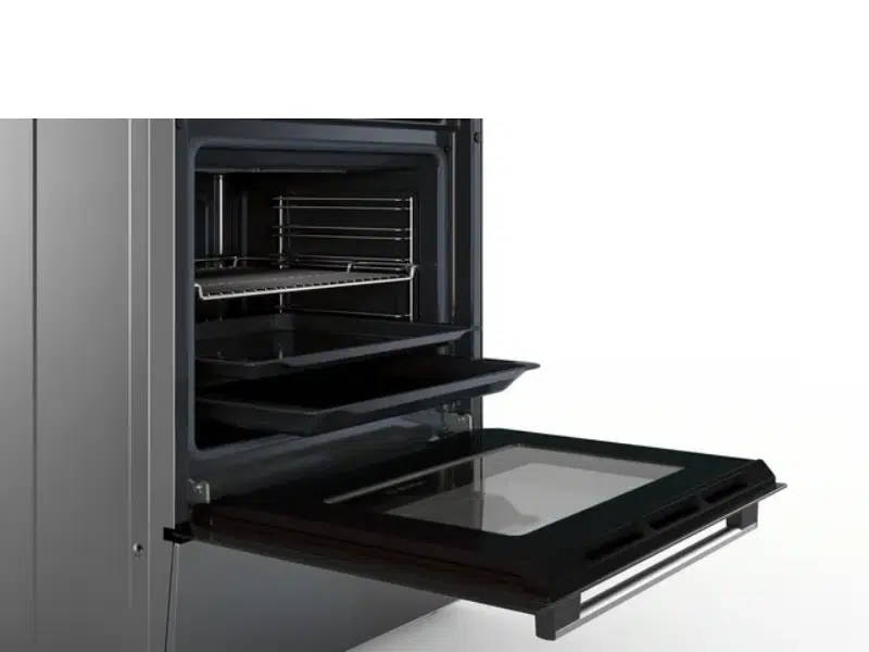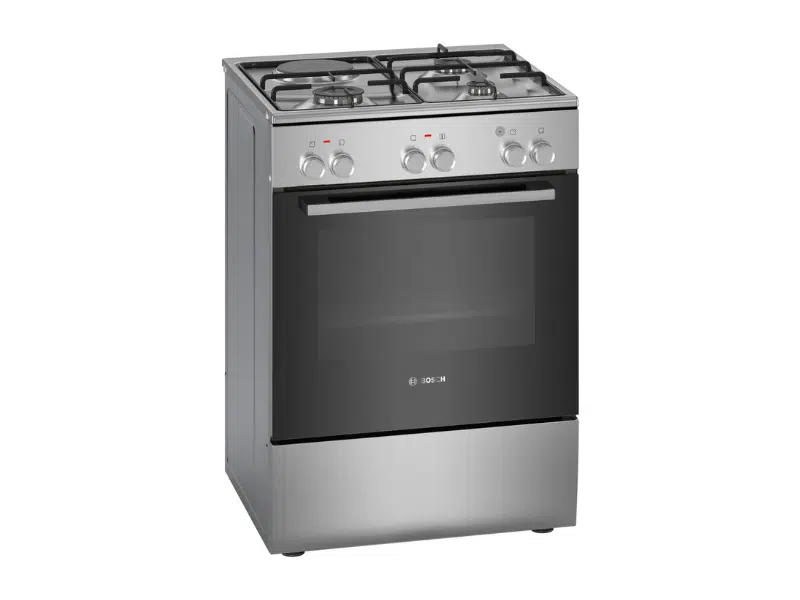 Bosch Series 2 Freestanding Dual Fuel Cooker HXA050F50S Dual Fuel Design: Combines 3 gas burners and 1 electric hotplate with an electric oven for flexible cooking. Full Flame Safety System: Automatically cuts off gas supply if the flame is extinguished. Five Cooking Modes: Multiple oven functions for versatile baking and roasting. Stainless Steel Finish: Durable, premium look that blends with modern kitchens. Top/Bottom Heat Mode: Consistent heat distribution for even cooking results. Easy-to-Clean Enamel Grates: Dishwasher-safe for hassle-free maintenance.