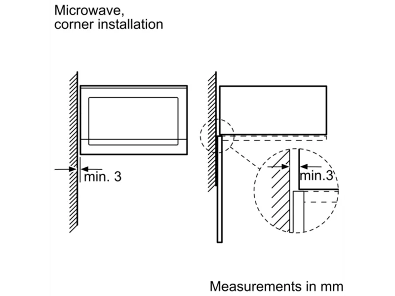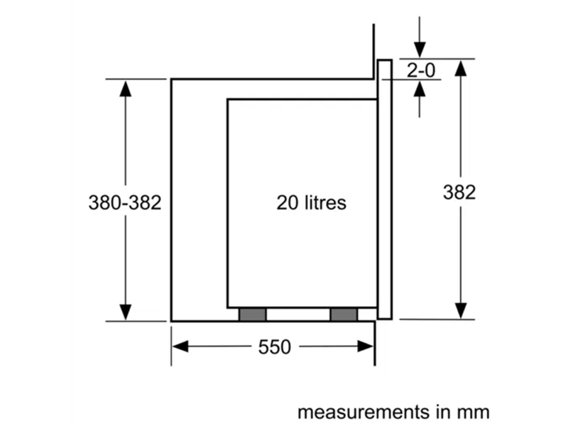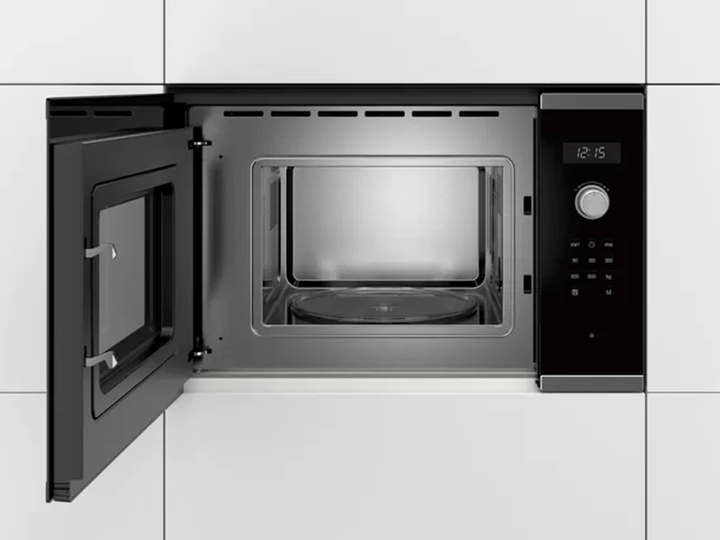 Bosch Series 6 Built-in Microwave Oven BFL524MS0B Automatic safety switch off Door contact switch AutoPilot, 7 LED light Integral cooling fan Electronic open button LED Display, white Side opening door, left hinged 25.5cm Glass turntable Cavity inner surface: Stainless steel Electronic clock timer Rotary dial, Retractable control dials, Touch controls, round, Start button Touch key operation Maximum microwave power level: 800 W and the following options 180 W, 360 W, 600 W, 800 W, 90 W 4 defrost and 3 cooking programmes in microwave function 1 memory setting Cavity volume: 20 l 130 cm Cable length Total connected load electric: 1.27 KW Nominal voltage: 230 – 240 V Appliance dimension (HxWxD): 382mm x 594mm x 317mm Niche dimension (HxWxD): 362mm – 365mm x 560mm – 568mm x 300mm For installation into a 60 cm wide wall unit, installation in tall housing Please refer to the dimensions provided in the installation manual Accessories: 1x Turntable