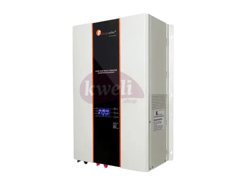 Felicity 10kVA/8kW 48V Pure Sine Wave Inverter IVPM10048 Model: IVPM10048 Max. Load: 8000 watts DC Input Voltage: 48V AC Output Voltage: 220V Output Frequency: 50/60HZ Max battery charging current: 80A Pure sine wave inverter Built-in MPPT solar charge controller 120A Selectable charging current based on applications Configurable AC/Solar input priority via LCD setting Compatible with mains voltage or generator power Over-Load Protection(SMPS load): Air switch protection Output Short Circuit Protection: Air switch protection Smart battery charger design for optimized battery performance Optional Remote Control Panel available | #KweliGotYou| Order Felicity 10kVA/8kW 48V Pure Sine Wave Inverter IVPM10048 with 120A MPPT Solar Charge Controller online and enjoy free delivery across Uganda > Long warranty > Lifetime After-sales Support