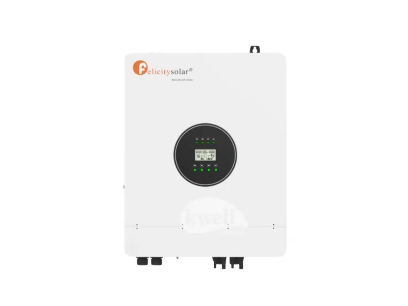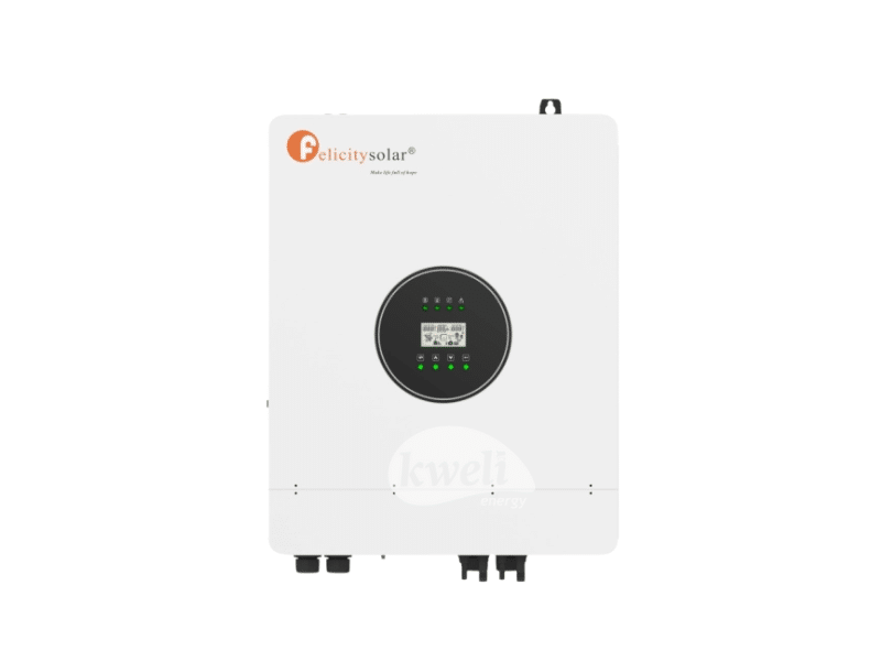 Description Felicity 8kVA/8kW 48V Hybrid Inverter IVEM8048 features Built-in MPPT solar charge controller for efficient solar power utilization. Supports grid-tied, off-grid, and backup functionality. Configurable AC/Solar charging priority and input voltage range via LCD. Compatible with lithium, lead-acid, and gel batteries. Built-in Wi-Fi for mobile monitoring (App required). Auto-restart while AC power is recovering. Parallel operation for scaling up to 6 units (requires battery connection). Configurable second AC output (customisable output time).