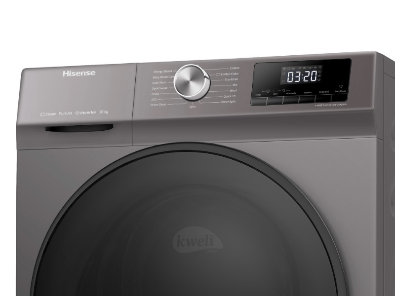 Hisense 10kg Front Load Inverter Washing Machine WF3Q1043BT Wash Capacity: 10kg Smart control Energy saving Pure Steam Technology Allergy Steam Care Durable smart inverter Pause and add items Intelligent LED Display Snowflake Drum Smart Spin Balance control. Quick wash Drum Self Clean 45-degree High Handle Design Max Spin Speed Option: 1200 rpm Rated power: 1750 watts 3-year warranty | #KweliGotYou| Order Hisense 10kg Front Load Inverter Washing Machine WF3Q1043BT; Pause & Add, Steam, 1,750 watts online and enjoy free delivery across Uganda > Long warranty > Lifetime After-sales Support
