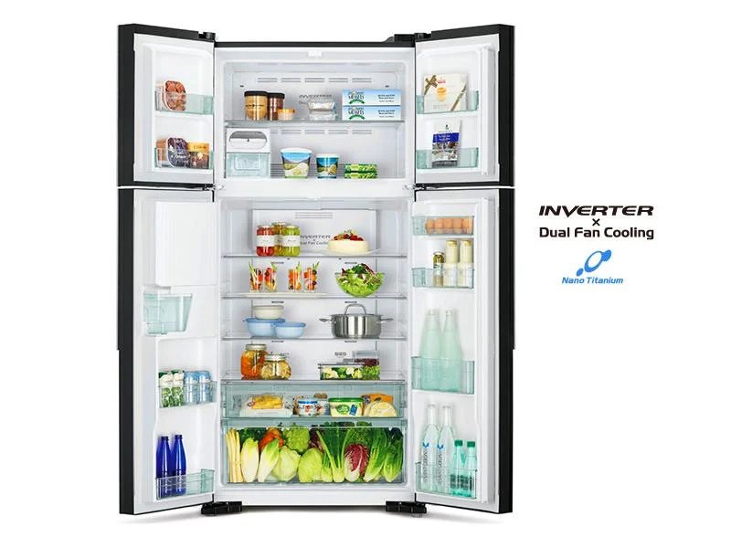 Description Hitachi 4 Door Fridge with Water Dispenser, Glass Black – RW660PUN7GBK Inverter Technology Compressor: Depending on the conditions inside the refrigerator and the outdoor environment, the Inverter compressor adjusts the cooling intensity to the appropriate level for optimal cooling at all times. INVERTER X Dual Fan Cooling The Hitachi Solution for Powerful Refrigeration Plus Exceptional Energy Saving. Fresh Select The Select Lever lets you adjust the inside temperature by switching between the two modes.