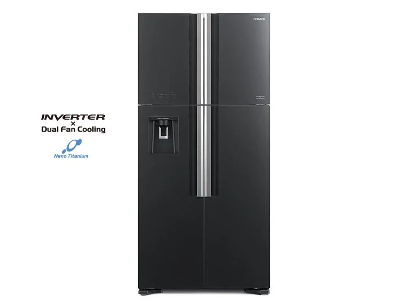 Hitachi 800/550 liter 4-Door Inverter Control Refrigerator + Water Dispenser, Glass Grey – RW660PUN7GGR Gross capacity: 800L Net capacity: 550L Material: Stainless Steel Inverter Control Dual Fan Cooling Eco Thermo Sensor Front Air Flow Selectable Mode Compartment Big, Moisture-Guard Vegetable Compartment Movable Twist Ice Tray LED Digital Control Panel Nano Titanium Tempered Glass Shelves No Frost, CFC Free, HFC Free Minus-Zero Hybrid Cooling System Nano Titanium Front Jet Freezing Electronic Control Tempered Glass Shelves Smart and Functional Vegetable Compartment Water Dispenser, Auto Ice Maker Free service and parts warranty – 1 year