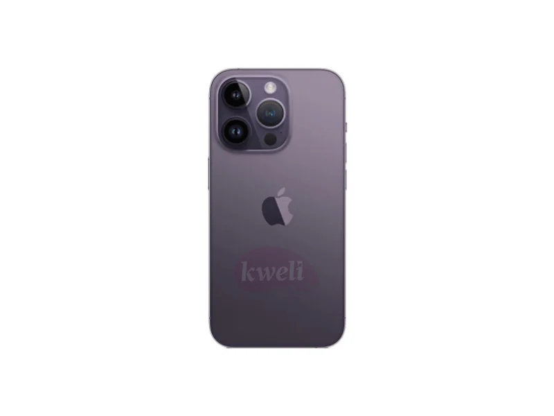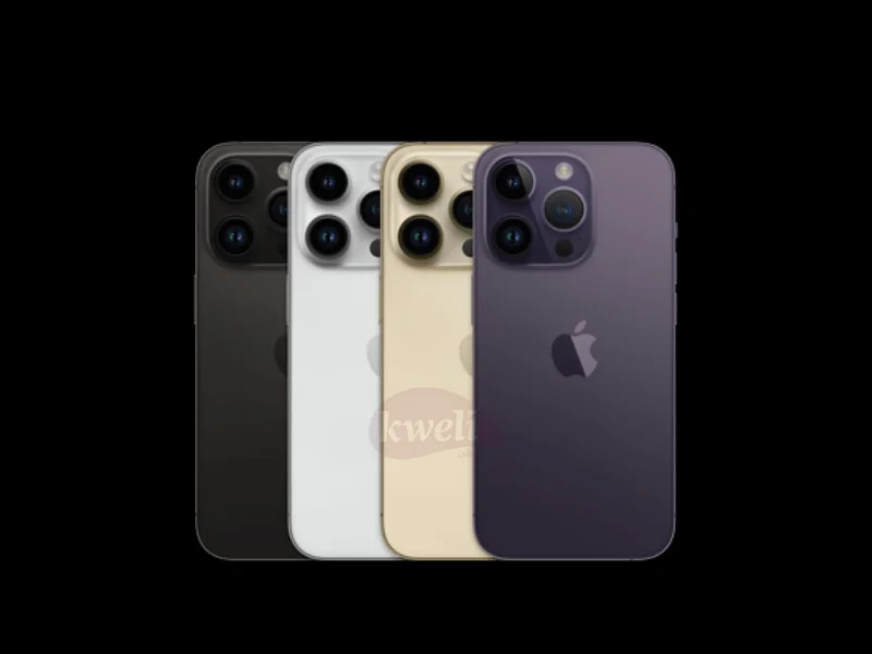 iPhone 14 Pro; 6GB, 256GB Super Retina XDR display 6.1‑inch (diagonal) all‑screen OLED display 2556‑by‑1179-pixel resolution at 460 ppi Operating system; iOS 16 Colours: Space Black, Silver, Gold, Deep Purple Ceramic Shield front Textured matte glass back and stainless steel design Weight: 206 grams (7.27 ounces) Memory: 6GB RAM, Storage: 256GB ROM Dynamic Island Always-On display ProMotion technology with adaptive refresh rates up to 120Hz HDR display True Tone Wide color (P3) Haptic Touch 2,000,000:1 contrast ratio (typical) 1000 nits max brightness (typical); 1600 nits peak brightness (HDR); 2000 nits peak brightness (outdoor) Fingerprint-resistant oleophobic coating Support for display of multiple languages and characters simultaneously Splash, Water, and Dust Resistant; Rated IP68 (maximum depth of 6 meters up to 30 minutes) under IEC standard 6052 Camera 48MP Main: 24 mm, ƒ/1.78 aperture, second-generation sensor-shift optical image stabilization, seven‑element lens, 100% Focus Pixels 12MP Ultra Wide: 13 mm, ƒ/2.2 aperture and 120° field of view, six‑element lens, 100% Focus Pixels 12MP 2x Telephoto (enabled by quad-pixel sensor): 48 mm, ƒ/1.78 aperture, second-generation sensor-shift optical image stabilization, seven‑element lens, 100% Focus Pixels 12MP 3x Telephoto: 77 mm, ƒ/2.8 aperture, optical image stabilization, six-element lens 3x optical zoom in, 2x optical zoom out; 6x optical zoom range; digital zoom up to 15x Sapphire crystal lens cover Adaptive True Tone flash Photonic Engine Deep Fusion Smart HDR 4 Portrait mode with advanced bokeh and Depth Control Portrait Lighting with six effects (Natural, Studio, Contour, Stage, Stage Mono, High‑Key Mono) Night mode Night mode portraits enabled by LiDAR Scanner Panorama (up to 63MP) Photographic Styles Macro photography Apple ProRAW Wide color capture for photos and Live Photos Lens correction (Ultra Wide) Advanced red‑eye correction Auto image stabilization Burst mode Photo geotagging Image formats captured: HEIF, JPEG, and DNG Video Recording 4K video recording at 24 fps, 25 fps, 30 fps, or 60 fps 1080p HD video recording at 25 fps, 30 fps, or 60 fps 720p HD video recording at 30 fps Cinematic mode up to 4K HDR at 30 fps Action mode up to 2.8K at 60 fps HDR video recording with Dolby Vision up to 4K at 60 fps ProRes video recording up to 4K at 30 fps (1080p at 30 fps for 128GB storage) Macro video recording, including slo-mo and time-lapse TrueDepth Camera 12MP camera ƒ/1.9 aperture Autofocus with Focus Pixels Six‑element lens Retina Flash Photonic Engine Deep Fusion Smart HDR 4 Portrait mode with advanced bokeh and Depth Control Face ID Enabled by TrueDepth camera for facial recognition iBeacon microlocation Apple Pay Safety Cellular and Wireless 5G (sub‑6 GHz) with 4x4 MIMO5 Gigabit LTE with 4x4 MIMO and LAA5 Wi‑Fi 6 (802.11ax) with 2x2 MIMO Bluetooth 5.3 Ultra Wideband chip for spatial awareness6 NFC with reader mode Express Cards with power reserve Battery Built‑in rechargeable lithium‑ion battery MagSafe wireless charging up to 15W11 Qi wireless charging up to 7.5W11 Charging via USB to computer system or power adapter Fast-charge capable: Up to 50% charge in around 30 minutes with 20W adapter or higher (available separately) Power and Battery10 Video playback: Up to 23 hours Video playback (streamed): Up to 20 hours Audio playback: Up to 75 hours | #KweliGotYou| Order iPhone 14 Pro; 6.1‑inch, 6GB RAM, 256GB Memory, 5G, iOS 16, 3200 mAh Battery, 48MP + 12MP + 12MP Camera online and enjoy free delivery across Uganda > Long warranty > Lifetime After-sales Support
