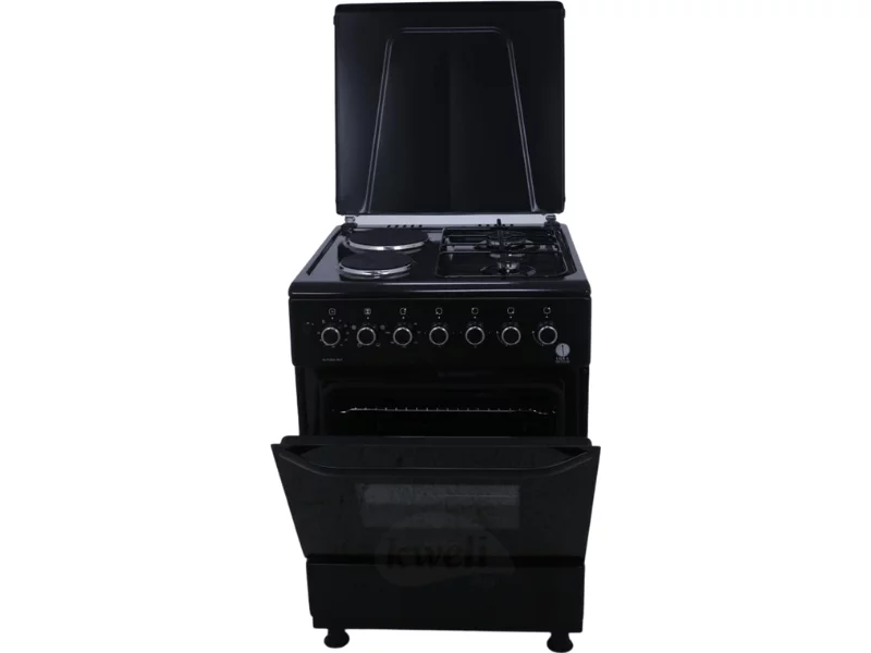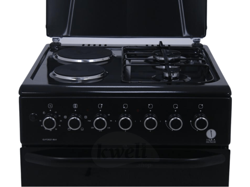 Buy new IQRA 50x60cm Cooker IQ-C2022-BLK; 2 Gas Burners + 2 Electric Plates with Electric Oven and Grill; Oven Timer, Black in Uganda - - Free Delivery > Long warranty > Lifetime After-sales Support