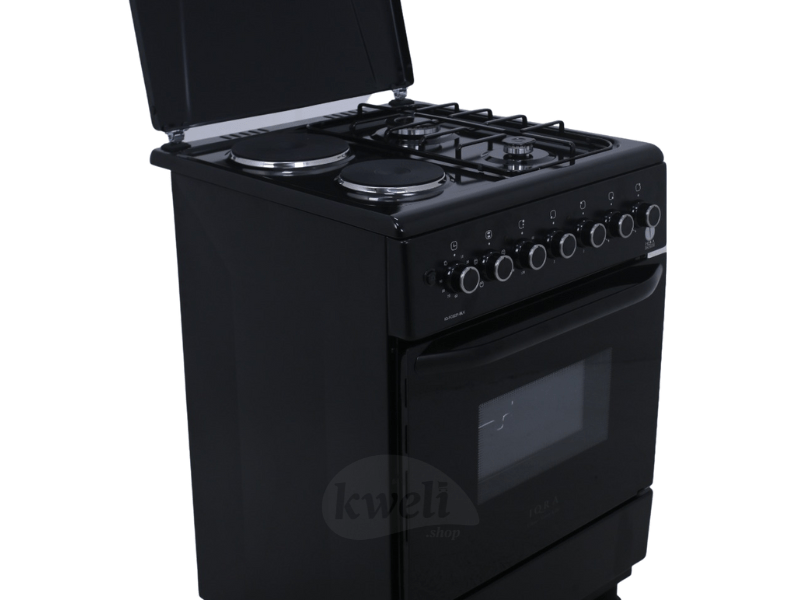 Buy new IQRA 60cm Cooker IQ-FC6221-BLK; 2 Gas Burners + 2 Electric Plates, Electric Oven and Grill, Timer, Enamel Pan Support, Black in Uganda - - Free Delivery > Long warranty > Lifetime After-sales