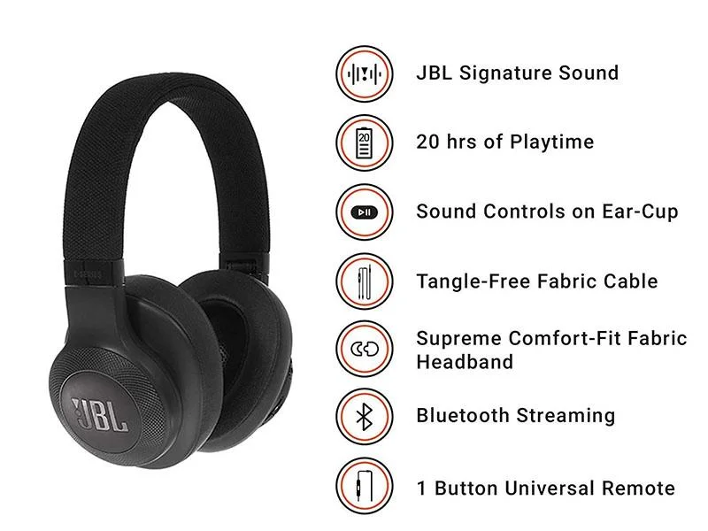 Description JBL E55BTC The JBL Bluetooth headphones deliver pure music enjoyment with the unmistakable JBL Signature Sound and their precisely fitting ergonomic design. When fully charged, the headphones can play music for up to 20 hours with a very short charging time of just 2 hours. Music playback and calls can either be easily controlled using the buttons on the earpiece or using the one-button remote control on the cable supplied . The tangle-free, textile-sheathed cable with its angled connector ensures that cable clutter is a thing of the past.
