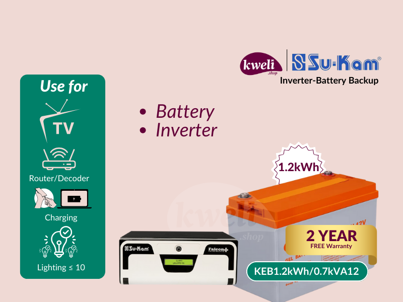 Kweli 1.2kWh-700VA-GEL Power Backup System Stay powered up with ease! Run up to 10 bulbs, TV, internet router, decoder, phone, and laptop during power outages. This reliable system charges via the grid (Umeme) and keeps your essential devices running smoothly. Compact, efficient, and perfect for maintaining your home’s basic appliances. The system features: Durable 1.2kWh Gel Battery. 700VA 12V Su-Kam Pure Sine Wave Inverter. Charge with Umeme/grid Low battery protection Overload protection The built-in changeover automatically switches to the backup when the power goes off 2-year system warranty This power backup system can power the following: TV up to 10 bulbs Phone charging Laptop charging Fan This package/offer includes: Battery Inverter load cable | #KweliGotYou| Order Kweli 1.2kWh-700VA-GEL Power Backup System; Run up to 10 Bulbs, TV, Internet Router, Decoder, Phone & Laptop Charging online and enjoy free delivery across Uganda > Long warranty > Lifetime After-sales Support
