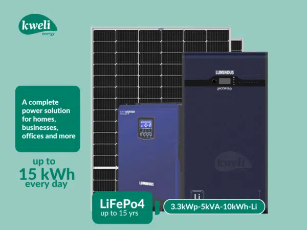 Description Kweli Energy 6kWp-20kWh-8kVA Lithium Hybrid Solar System Stay powered with the Kweli Energy 6kWp-20kWh-8kVA Lithium Hybrid Solar System. Generate up to 25 units of clean solar energy daily, store up to 20 kWh in a high-capacity lithium battery bank, and enjoy seamless automatic switchover to Umeme or a generator when needed. With FREE Wi-Fi monitoring and compatibility with grid/UEDCL and generators, this system provides reliable, efficient, and future-ready power for homes, offices, and commercial spaces. Key Equipment 6 kWp Monocrystalline Solar Panel Array; high-efficiency 550–620 Wp modules generating about 24–26 kWh of solar energy daily under optimal conditions. 20 kWh 48V Lithium Battery Bank; long-life LiFePO₄ battery system with ≥6,000 cycles at 80% DoD, built-in BMS, providing reliable energy storage for extended runtimes and daily cycling. 8 kVA / 8 kW 48V Hybrid Inverter; pure sine wave output with integrated MPPT solar charge controller for efficient solar utilisation and stable AC output. Supports charging from solar, grid/UEDCL, or generator with seamless automatic switchover. Aluminium Rail Panel Mounting Kit; robust, weather-resistant rails designed to securely hold panels while maximising solar exposure. Accessories & Kits PV Safety & Protection Kit: safeguards the solar array and inverter from overcurrent and voltage spikes induced by nearby lightning or switching events while allowing safe isolation during maintenance. AC Safety & Protection Kit: protects appliances and users from electric shock, overloads, and voltage surges, including those that may come through grid or generator lines during storms. AC Power Distribution Kit: enables safe switching between grid and generator while distributing stable power to connected loads through well-organised breaker boxes. Installation Cabling & Connectors: a complete set of PV, battery, and AC cables with trunking, connectors, and fittings for a neat, durable, and professional installation. FREE Wi-Fi Router plus Remote Monitoring Kit; provides real-time monitoring of solar generation, battery charge levels, and load usage from anywhere. User Manual & Documentation: includes system operation guide, warranty cards, and a complete handover pack for easy reference.
