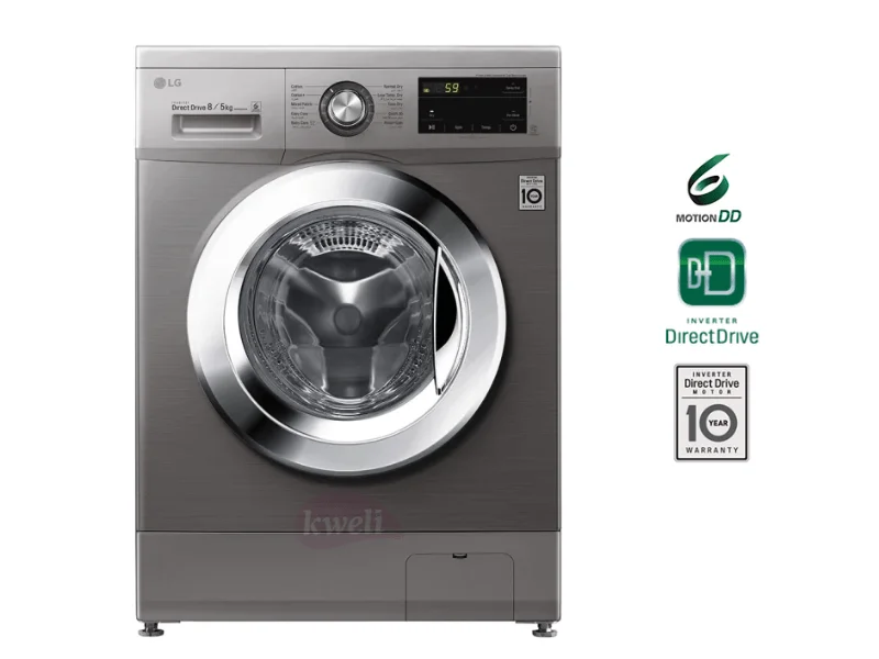 LG 8/5kg Front Load Washer/Dryer F4J3TMG5P Washing Capacity: 8kg Drying capacity: 5kg Inverter Direct Drive 6 motion DD Chrome Knob 1200 RPM Smart Diagnosis with LG Thinq 13 programs 2 years warranty | #KweliGotYou| Order LG 8/5kg Front Load Washer/Dryer F4J3TMG5P; 6-motion Direct Drive, 1200rpm, Baby Care, Quick Wash online and enjoy free delivery across Uganda > Long warranty > Lifetime After-sales Support