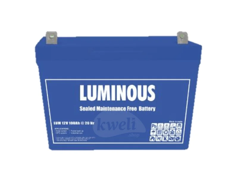 Luminous 100AH 12V Sealed Maintenance-free Battery - VRLA BATTERY Luminous VRLA batteries are specially designed with AGM (Absorbent Glass Mat) technology, high-performance plates and electrolytes. Amp Hours: 100AH Voltage (DC): 12V Max. Discharge Current: 620A for 5 Seconds at 27°C Capacity (27°C): 20Hr (5.00A, 10.50V) Self Discharge: 3% of capacity declined per month at 20°C (average) Sealed and Maintenance-free operation. Non-Spillable construction design. Safety valve installation for explosion proof. High quality and high reliability. ABS container. Low self-discharge characteristic. Positive plate: Lead dioxide Negative plate: Lead Container: ABS Cover: ABS Safety Valve: Rubber Terminal: Lead alloy Separator: AGM Electrolyte: Sulfuric acid | #KweliGotYou| Order Luminous 100AH 12V 1.2kWh Battery, 10Hr, Sealed Maintenance-free VLRA Battery, Made in India online and enjoy free delivery across Uganda > Long warranty > Lifetime After-sales Support