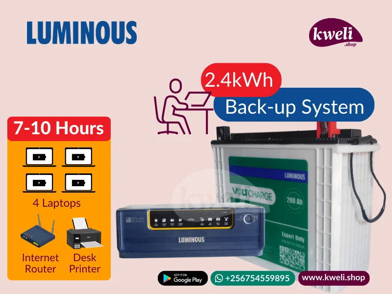 Luminous 2.4kWh 850watt Office Power Back-up System The system features; Highly efficient 200AH 12V Luminous Tubular Battery. 850VA 12V Luminous Hybrid Inverter. Charge with Umeme/Grid or charge with Solar. Low battery protection Overload protection Built-in changeover to automatically switch to the backup when power goes off Built-in charge controller Wide operating panel voltage range 1-year FREE warranty This power backup system can power the following; TV 4-6 Laptops Phone charging Internet router Desk printer