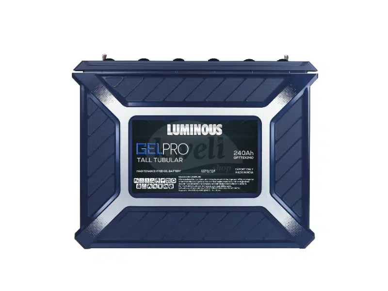 Description Luminous 240Ah 12V Gel Battery GPTTEX 240 The Luminous GPTTEX 240 is a powerful 240Ah 12V tall tubular gel battery designed for solar and backup use. With over 1,500 charge cycles at 50% DoD, it offers long-lasting performance, zero maintenance, and safe, spill-proof operation—perfect for homes, offices, and off-grid systems that need reliable energy every day. Key Features Gel Technology: No water top-up required; spill-proof and maintenance-free. Gelled Electrolyte: Prevents stratification and plate shedding, supports partial state-of-charge (PSOC) operation, and offers a longer life span. Deep Cycle Design: Offers stable backup duration with high energy efficiency. High-Grade Imported Separator: Ensures low electrical resistance and high charging efficiency. Built-in Pressure Release Valve: Explosion-proof and self-regulating for internal pressure. Eco-Friendly: No fume emissions, making it safer for indoor and residential use. Technical Specifications Model: GPTTEX 240 Battery Type: Tall Tubular Gel VRLA Voltage: 12V Capacity: 240Ah @ C20, 215Ah @ C10 Weight: 79kg Dimensions (L x W x H): 504 x 186 x 407 mm Material: Polypropylene (Blue Case & Cover) Charge Voltage (Boost/Cycle Use): 14.40 – 14.80V (max current 30A) Float Voltage (Standby Use): 13.60 – 13.80V Self-Discharge Rate: <3% per month at 20°C Operating Temperature: -20°C to +45°C Backup Duration (up to 10.5V Terminal Voltage) 700W: 3 hrs 15 mins 600W: 3 hrs 45 mins 500W: 4 hrs 45 mins 400W: 7 hrs 300W: 8 hrs 30 mins 200W: 14 hrs 100W: 24 hrs 30 mins Applications Solar and hybrid energy systems Inverter and UPS backup Off-grid and residential energy storage Telecom and industrial standby power