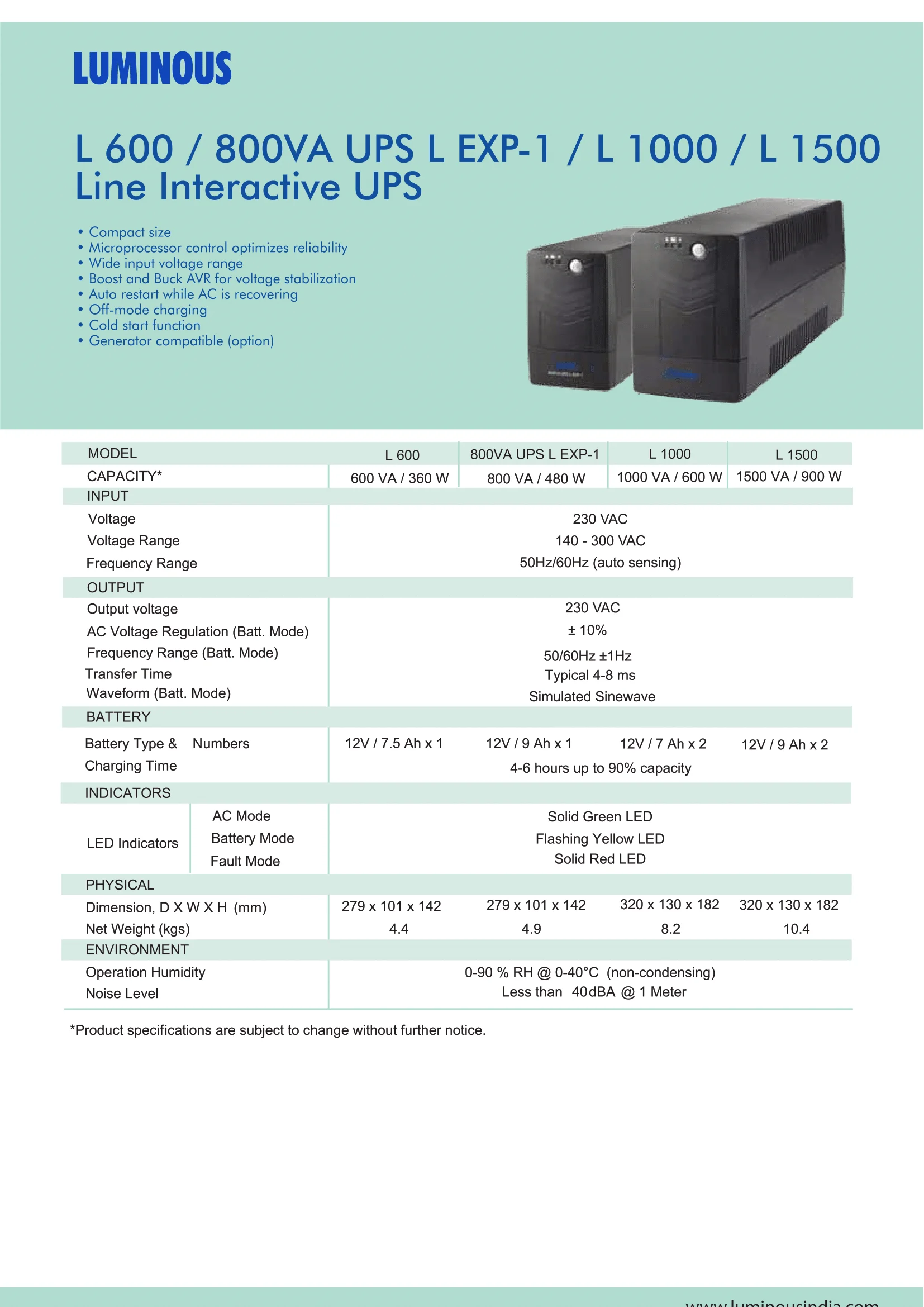 Luminous 600VA 360W Computer UPS LB600PRO Capacity: 600VA, 360watts Voltage: 230V, AC Voltage range: 140-300VAC Compact size, Microprocessor control optimizes reliability Boost and buck AVR voltage stabilization Auto restart while AC is recovering Off-mode charging Cold start function Generator compatible option Made in India 1-year warranty | #KweliGotYou| Order Luminous 600VA 360W Computer UPS LB600PRO - Uninterupted Power Supply - Made in India online and enjoy free delivery across Uganda > Long warranty > Lifetime After-sales Support