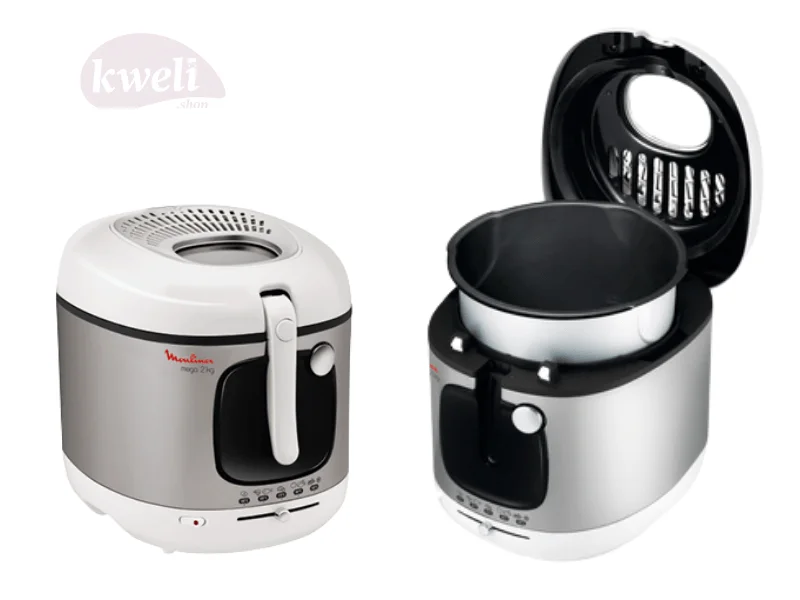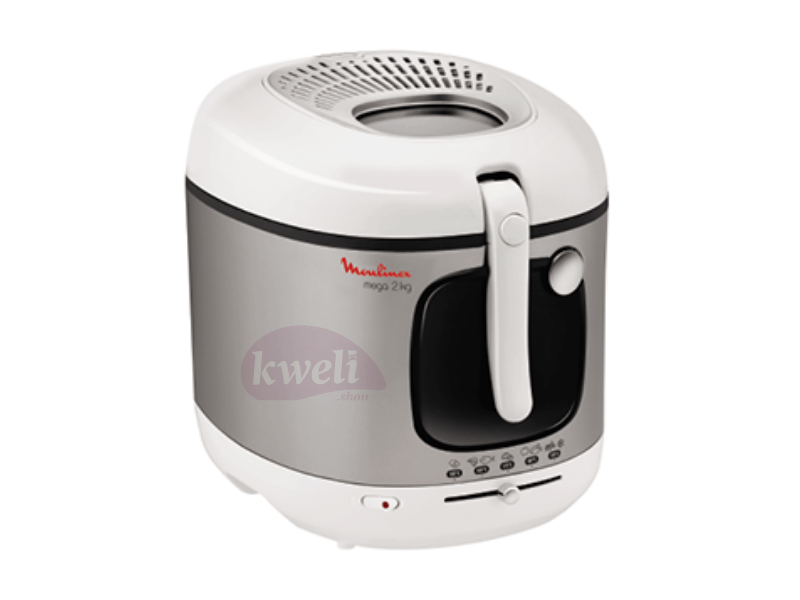 Description A deep fryer for the whole family Mega 2 Kg fryer has the biggest capacity among Moulinex fryers. It will enable you to cook 2 Kg of French fries in one. The design is modern: silver and black with a shiny metal button to open the lid. With its removable bowl with a non-stick coating, this deep-fryer is easy to clean. All parts – except housing – are dishwasher safe. With Moulinex Mega 2 Kg electric deep fryer, get ready to prepare delicious and crispy French fries in just a few minutes.