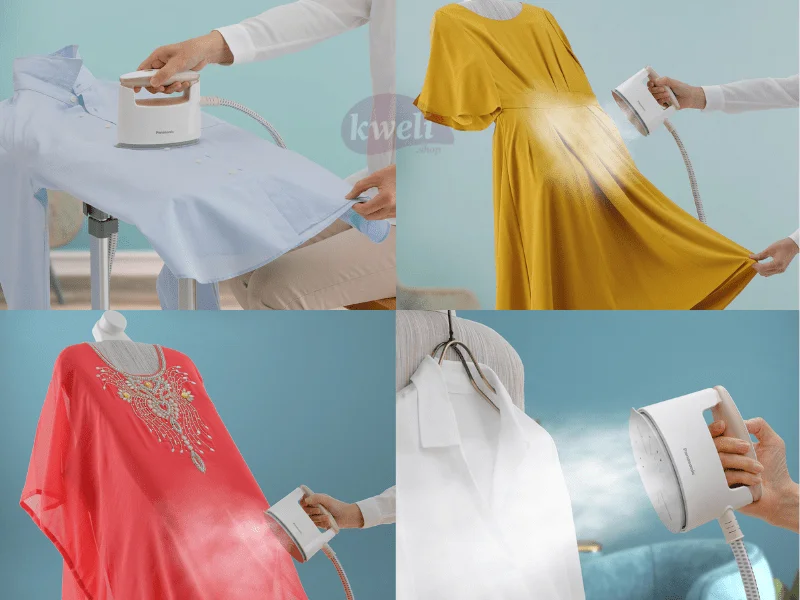 Panasonic Garment Steamer NIGWF150WTH Remove tough wrinkles with powerful steam generated from 2400W Twin Boilers. Free Angle Adjustment to suit your ironing and steaming style Matching your height and clothes with Onetouch Height Setting Fine finishing with Ceramic Soleplate Water Tank Capacity:1.6 Litres Power Cord Length:1.5 m ... years FREE warranty | #KweliGotYou| Order Panasonic Garment Steamer NIGWF150WTH; 2400W online and enjoy free delivery across Uganda > Long warranty > Lifetime After-sales Support