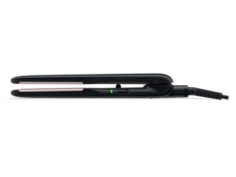 Glossy and sleek with shine with 100mm long plates 100m long plates for fast and easy straightening 210°C professional high heat for perfect results Fast heat up time, ready to use in 60 seconds Closing lock to close the handle for easy and safe storage Universal voltage Swivel cord to prevent tangled wires Shiny and frizz-free hair 1.8 m power cord